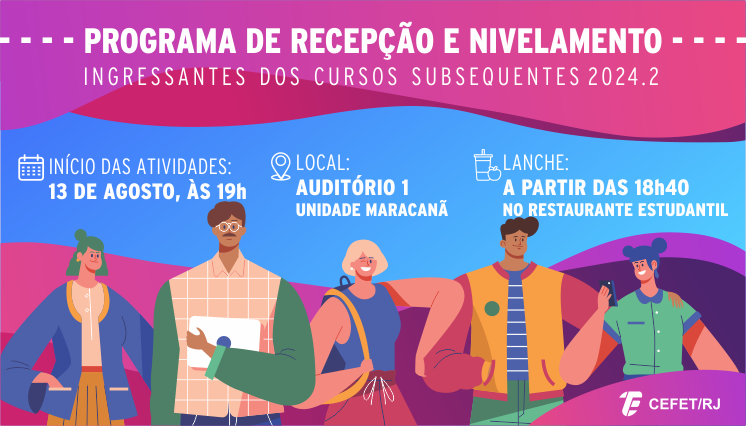 O Departamento de Ensino Médio e Técnico (DEMET) do Cefet/RJ informa que a recepção aos alunos ingressantes nos cursos técnicos subsequentes da Unidade Maracanã começará dia 13 de agosto. As atividades serão realizadas das 19h às 21h e o lanche será distribuído das 18h40 às 19h no restaurante estudantil.