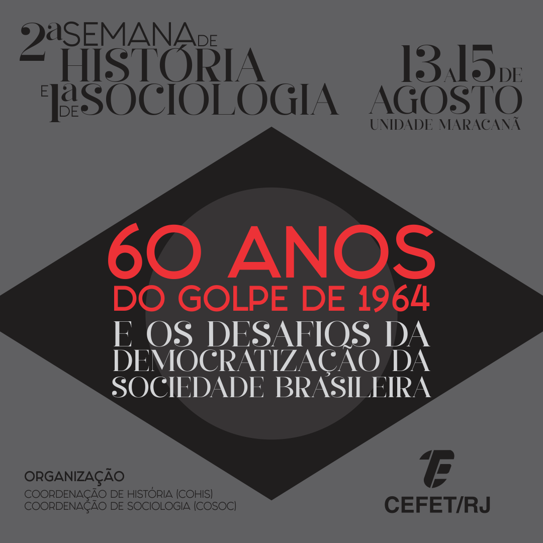 As coordenações de História e Sociologia do Cefet/RJ promovem o evento "60 Anos do golpe de 1964 e os desafios da democratização da sociedade brasileira", de 13 a 15 de agosto, na Unidade Maracanã. O encontro faz parte da 2ª Semana de História e da 1ª Semana de Filosofia, é aberto ao público e contará com uma programação de palestras que ocorrerão no Auditório 5 e na sala A301 da unidade.