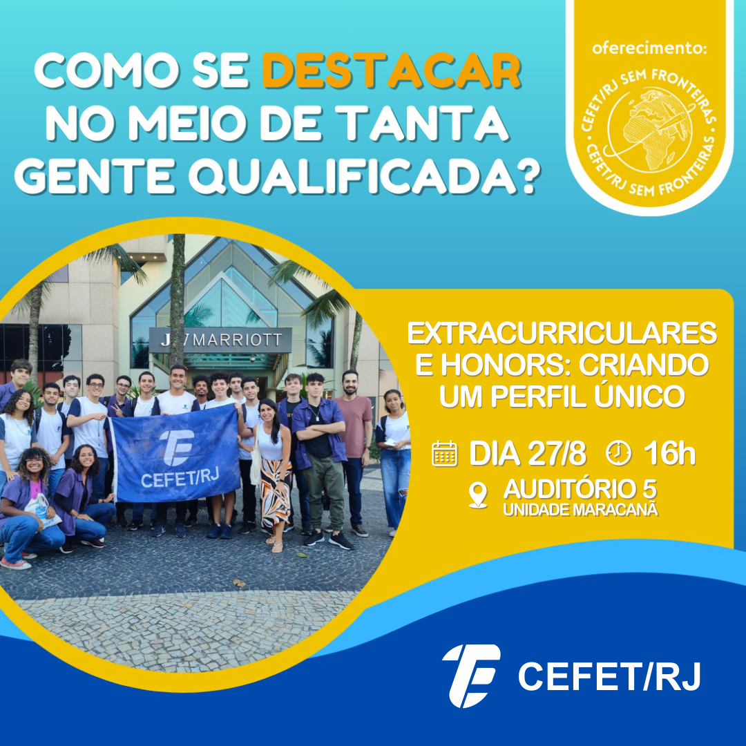 O Departamento de Ensino Médio e Técnico (DEMET) do Cefet/RJ, em parceria com a Coordenação de Língua Estrangeira (COLIE), realizará a palestra “Extracurriculars & honors: criando um perfil único”. O evento, que faz parte do projeto de extensão “CEFET sem Fronteiras”, acontecerá no dia 27 de agosto, às 16h, no Auditório 5 da Unidade Maracanã, e será voltado para alunos do ensino médio/técnico e do subsequente, além de estar aberto ao público em geral.