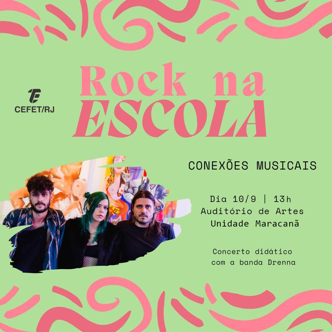 No dia 10 de setembro, às 13h, o Auditório de Artes do Cefet/RJ Unidade Maracanã será palco da apresentação “Rock na escola – conexões musicais”, com participação da cantora Drenna e sua banda. O evento faz parte do projeto de extensão “Música no Cefet – concertos didáticos”, coordenado pelos professores Bruno Repsold e Daniela Spielmann.