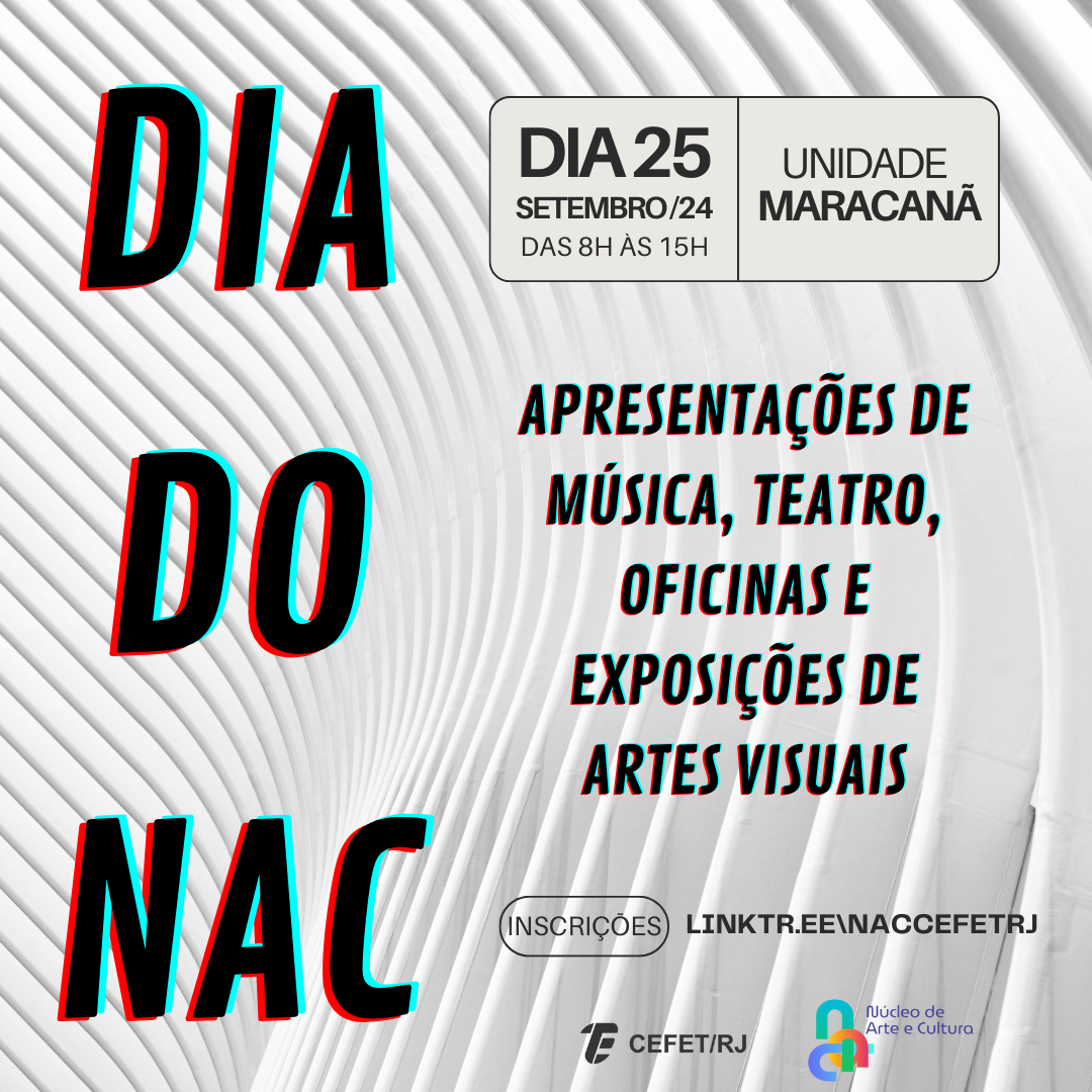 No dia 25 de setembro, o Cefet/RJ Unidade Maracanã será palco do Dia do NAC, uma iniciativa do Núcleo de Arte e Cultura da instituição. O evento busca promover o talento artístico e acadêmico da comunidade escolar, além de fortalecer o vínculo entre as unidades da instituição. A programação, que acontece das 8h às 15h, contará com apresentações de música, teatro, oficinas e exposições de artes visuais, além da participação de convidados externos.