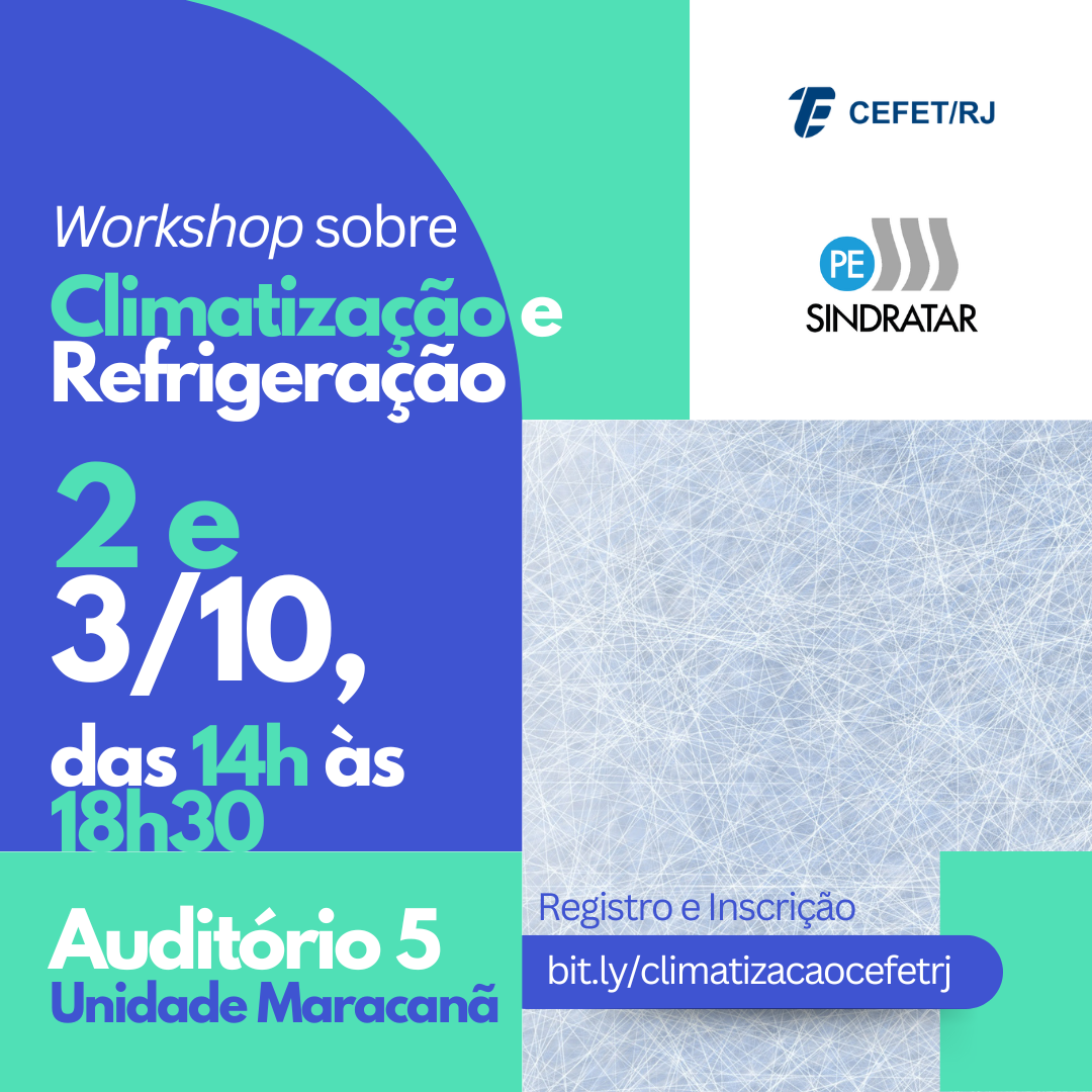 O Cefet/RJ, em parceria com o Sindicato da Indústria de Refrigeração, Aquecimento e Tratamento de Ar do Estado do Rio de Janeiro (Sindratar-RJ), promoverá nos dias 2 e 3 de outubro o Workshop em Climatização e Refrigeração, como parte do Programa de Extensão em Climatização e Refrigeração da instituição. Coordenado pelos professores Carlos Catunda e Sylvio Magran, o evento será aberto ao público e ocorrerá no Auditório 5 da Unidade Maracanã, das 14h às 18h30. Para participar será necessário se inscrever por este link.