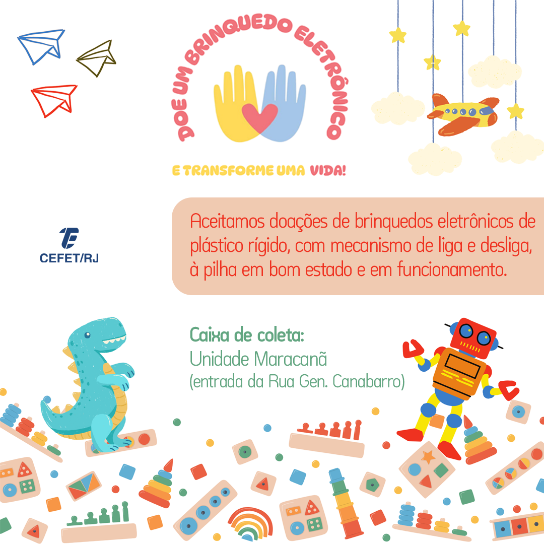 A equipe EVENTEC, formada por alunos do curso técnico em Eventos, em parceria com estudantes do curso técnico em Eletrotécnica, está promovendo uma campanha no Cefet/RJ para arrecadar e adaptar brinquedos eletrônicos para crianças com deficiência. A coleta acontece na Unidade Maracanã, próximo às catracas da entrada da rua General Canabarro, até a próxima segunda-feira (7).