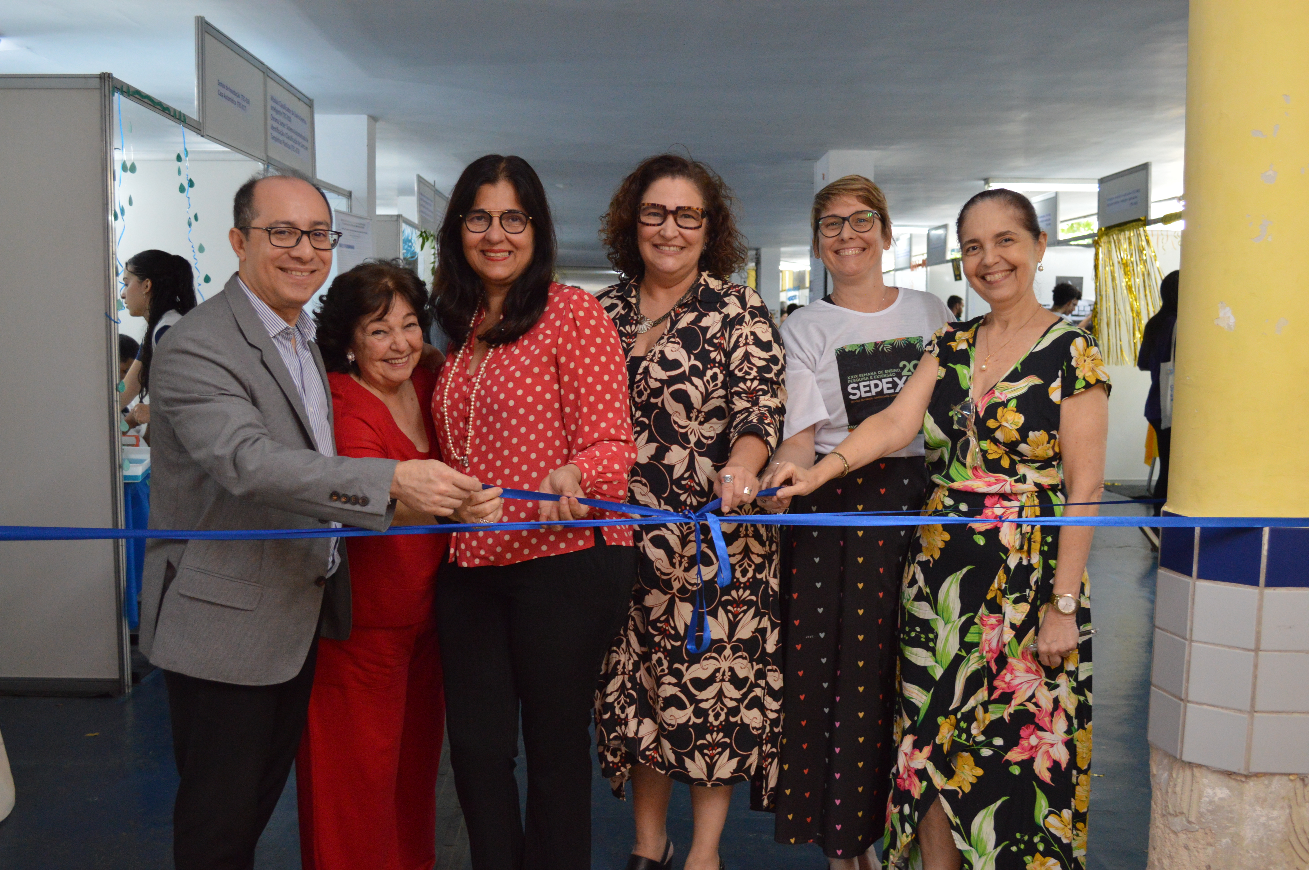 Na cerimônia de abertura, estavam presentes (da esq. para a dir.): o diretor-geral, Mauricio Motta, a diretora de Gestão Estratégica, Célia Machado, a vice-diretora, Gisele Vieira, a diretora de Extensão, Renata Moura, a diretora de Ensino, Dayse Pastore, e a chefe do Departamento de Extensão e Assuntos Comunitários (DEAC), Alice Caggiano