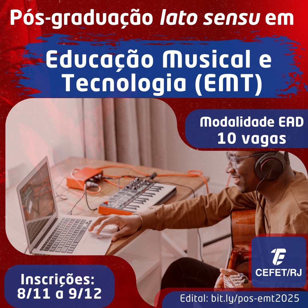 O Cefet/RJ disponibilizou para consulta o edital relativo à primeira turma da pós-graduação lato sensu em Educação Musical e Tecnologia (EMT), na modalidade educação a distância. O processo seletivo abre 10 vagas para pessoas com curso superior completo em qualquer área do conhecimento, preferencialmente em licenciatura em Música, Dança, Teatro, Artes Visuais ou bacharelado nas diversas linguagens artísticas. Metade das oportunidades é reservada a pessoas negras, indígenas e quilombolas e outras duas vagas a pessoas com deficiência. A pós-graduação terá duração de 12 meses e será ofertada pela Unidade Maracanã.