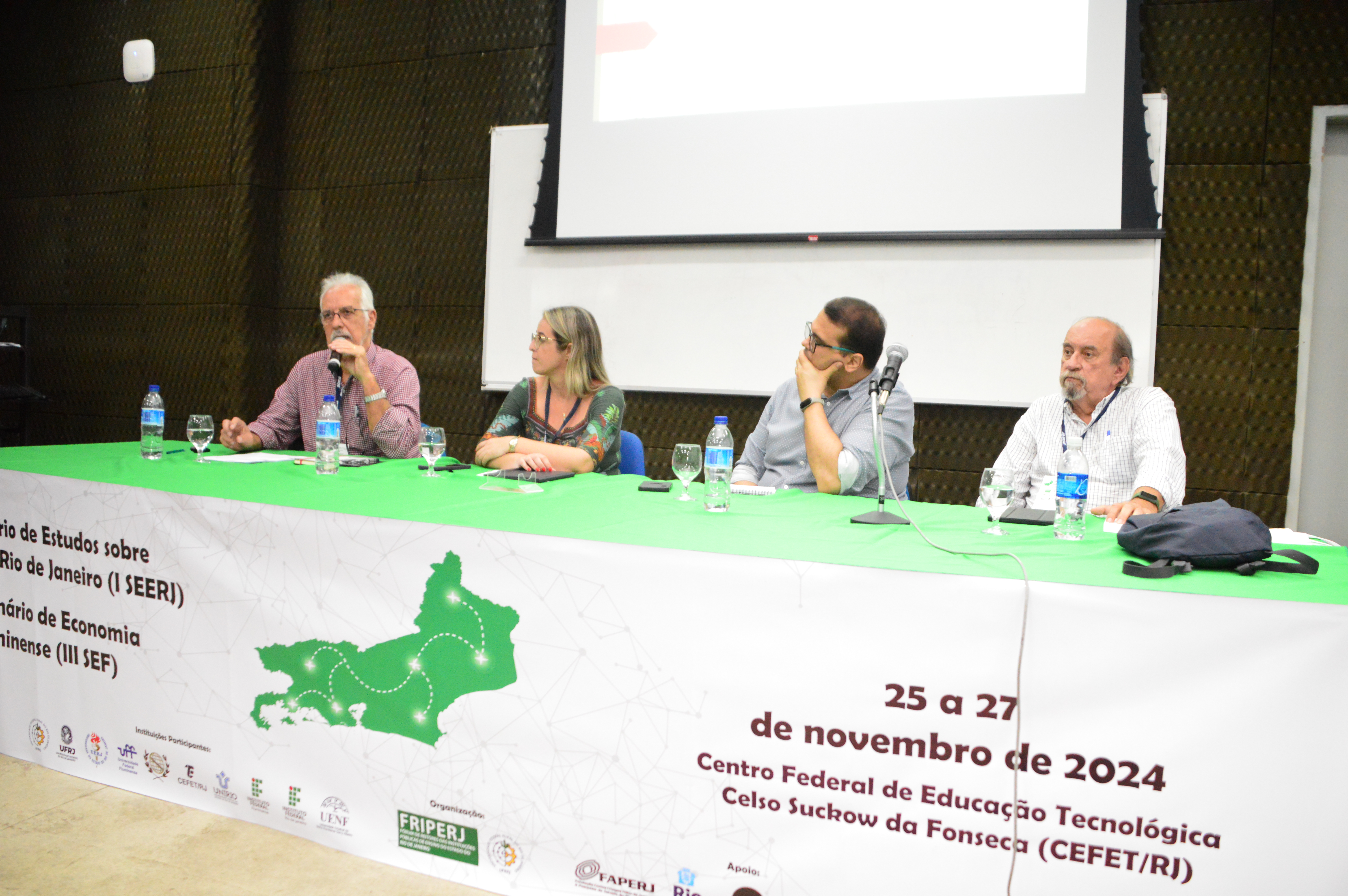 Da esq. para a dir., Floriano Godinho (Uerj); Maria Viviana de Freitas (mediadora); Israel Marcelino (UFRRJ) e Cláudio Egler (UFRJ)