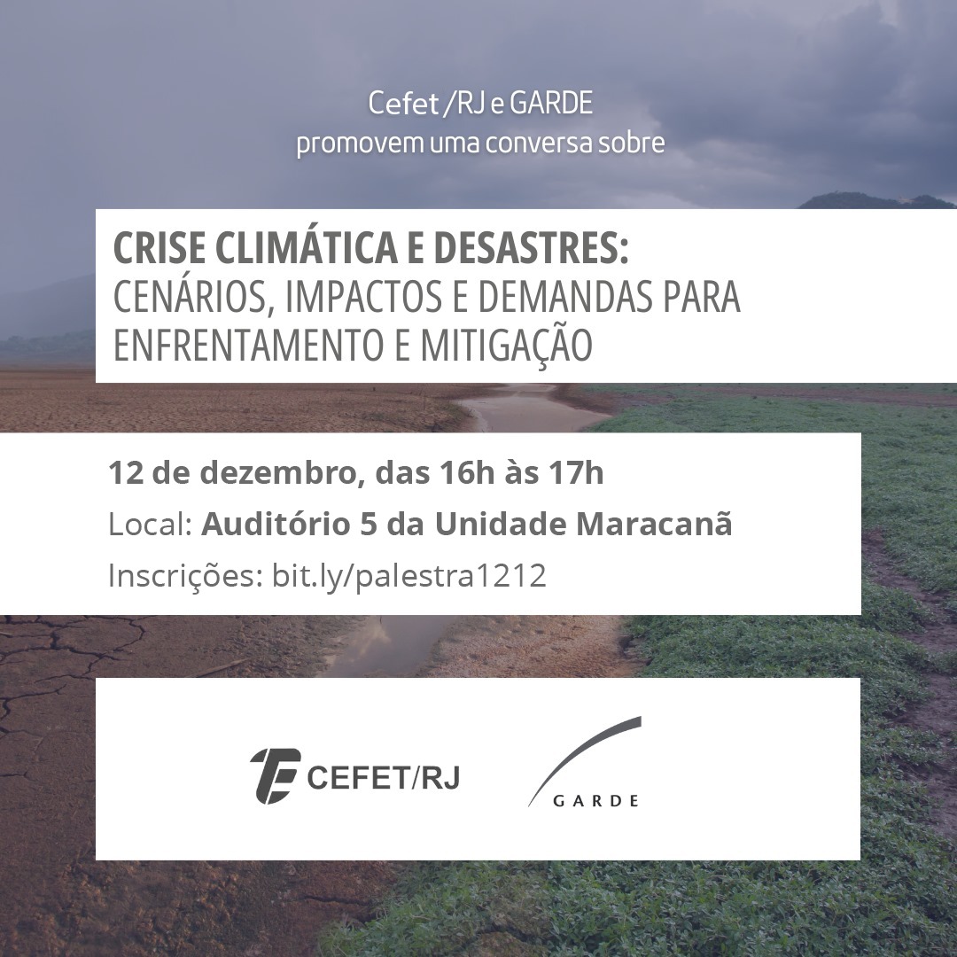 No próximo dia 12 de dezembro, o Programa de Redução de Riscos de Desastres (RRD) do Cefet/RJ promoverá a palestra “Crise climática e desastres: cenários, impactos e demandas para enfrentamento e mitigação”. O evento acontecerá no Auditório 5 da Unidade Maracanã, das 16h às 17h30, e terá como palestrante Alexandre Cabral, diretor-geral da Associação Global para Resiliência, Redução do Risco de Desastres e Meio Ambiente (GARDE). O evento é aberto à comunidade acadêmica e é indicado também a profissionais, pesquisadores, políticos e outras pessoas interessadas no tema. As inscrições podem ser feitas pelo link bit.ly/palestra1212.