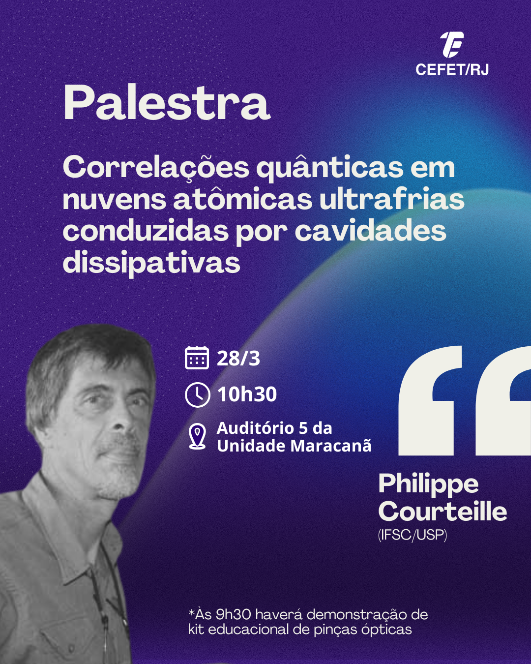 O evento será ministrado pelo professor Philippe Courteille, responsável pela linha de pesquisa de interação da radiação com a matéria ultrafria do Instituto de Física de São Carlos da Universidade de São Paulo (IFSC/USP). De acordo com os organizadores da iniciativa, a palestra promoverá um intercâmbio científico na área de óptica.