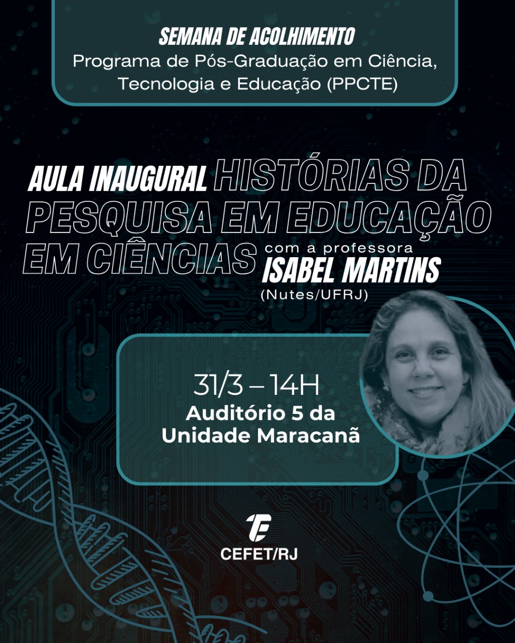 Nos dias 31 de março e 1º de abril, o Programa de Pós-Graduação em Ciência, Tecnologia e Educação (PPCTE) vai promover a Semana de Acolhimento aos Alunos do PPCTE, para dar as boas-vindas aos estudantes ingressantes. Na abertura, será realizada a aula inaugural “Histórias da pesquisa em educação em Ciências”, ministrada pela professora Isabel Martins, do Programa de Pós-Graduação em Educação em Ciências e Saúde, da Universidade Federal do Rio de Janeiro (Nutes/UFRJ). O evento acontecerá no Auditório 5 da Unidade Maracanã e é aberto à comunidade. Não há necessidade de realizar inscrição.