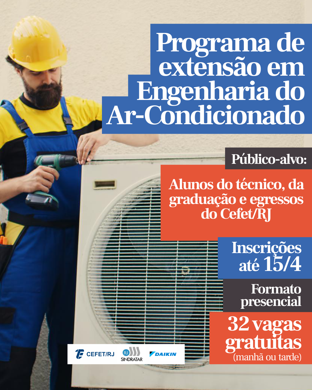 Estão abertas as inscrições para a 3ª turma do programa de extensão em Engenharia do Ar-Condicionado do Cefet/RJ, realizado em parceria com o Sindicato da Indústria de Refrigeração, Aquecimento e Tratamento do Ar do Estado do Rio de Janeiro (Sindratar-RJ) e apoio da empresa Daikin Brasil.