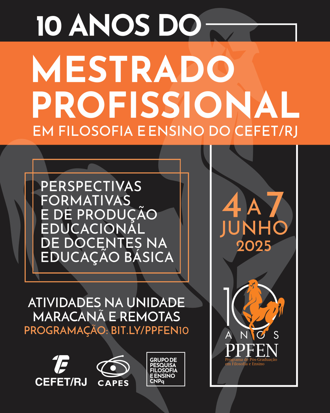 Em comemoração aos seus 10 anos de atuação, o Programa de Pós-Graduação em Filosofia e Ensino (PPFEN) do Cefet/RJ realiza o evento “Perspectivas formativas e de produção educacional de docentes na educação básica”. O encontro acontecerá entre os dias 4 e 7 de junho de 2025, na Unidade Maracanã, em formato híbrido (com atividades presenciais e remotas). A iniciativa tem o apoio do Grupo de Pesquisa em Filosofia e Ensino, cadastrado no CNPq e na CAPES.