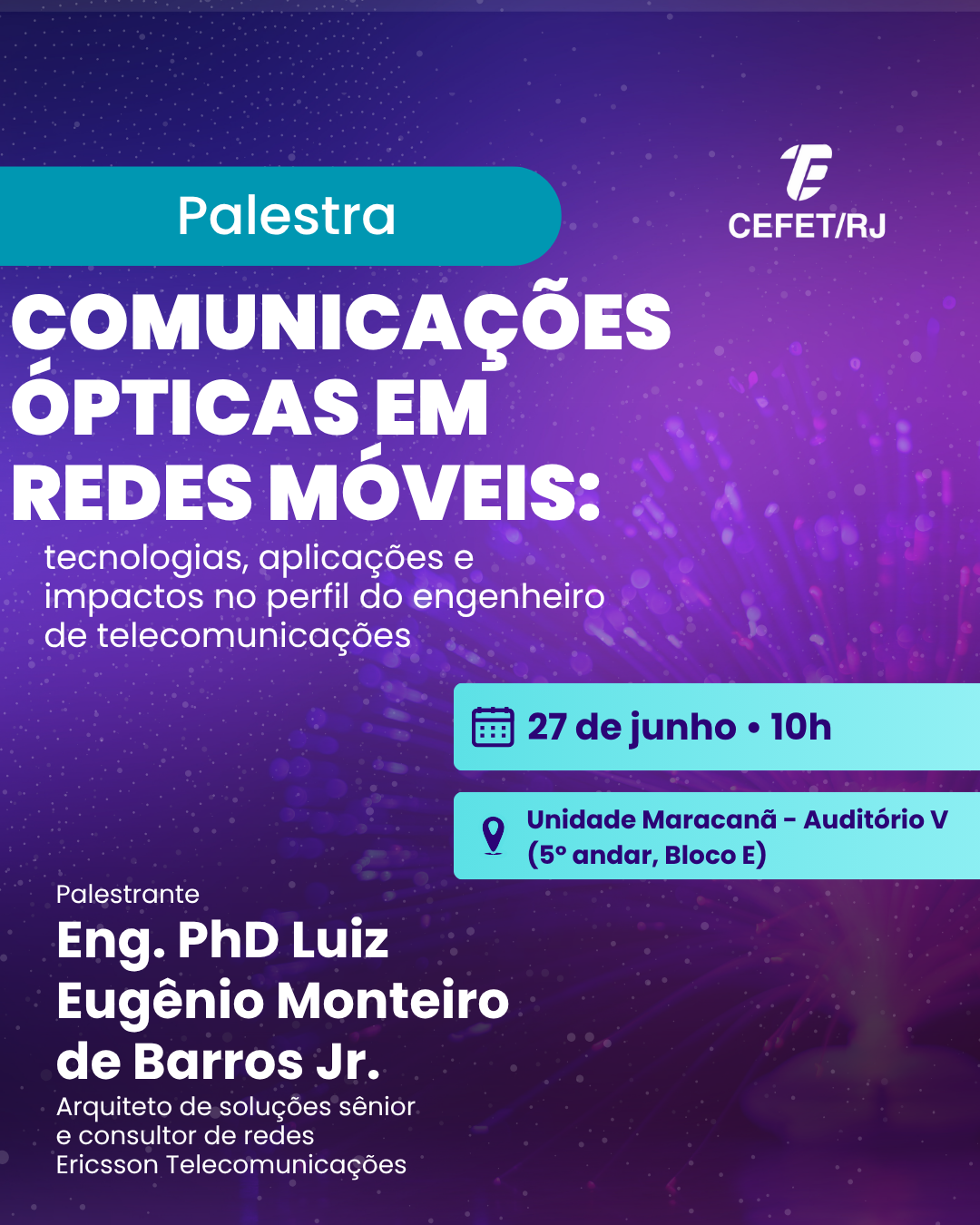 O Laboratório de Fotônica do Cefet/RJ, vinculado aos Programas de Pós-Graduação em Engenharia Elétrica (PPEEL) e em Instrumentação e Óptica Aplicada (PPGIO) realiza a palestra “Comunicações ópticas em redes móveis: tecnologias, aplicações e impactos no perfil do engenheiro de telecomunicações”, com o engenheiro PhD Luiz Eugênio Monteiro de Barros Jr., da Ericsson Telecomunicações. O evento acontecerá no dia 27 de junho, às 10h, no Auditório V da Unidade Maracanã (5º andar, bloco E) e é aberto aos alunos e à comunidade externa. Não é necessário realizar inscrição prévia.