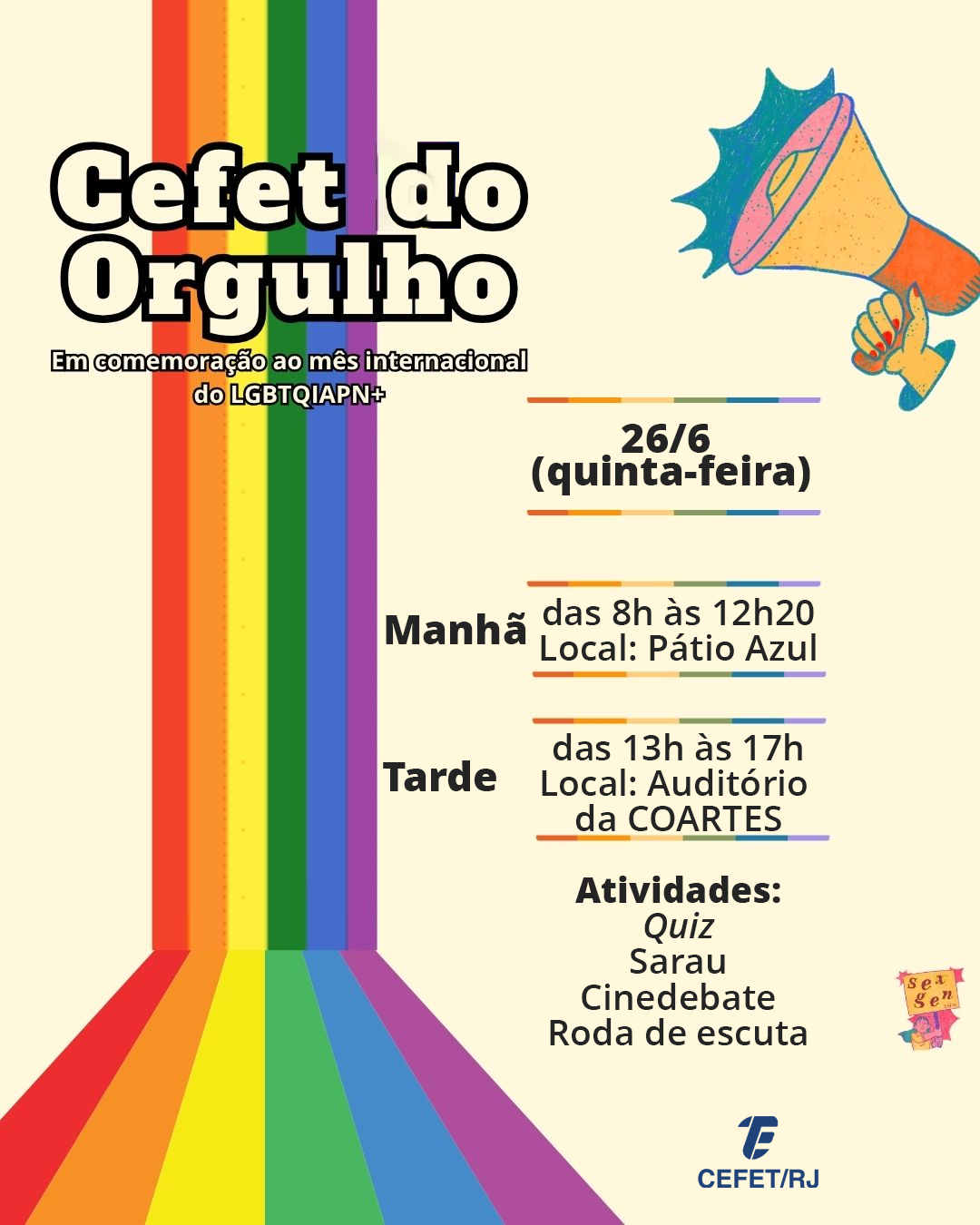 No dia 26 de junho, o Núcleo de Gênero e Diversidade Sexual (NUGEDS) do Cefet/RJ realizará seu primeiro evento na Unidade Maracanã. Com o tema "Cefet do Orgulho", a programação acontecerá ao longo de todo o dia e tem como objetivo apresentar à comunidade os integrantes do núcleo, suas pautas, ações e desafios.