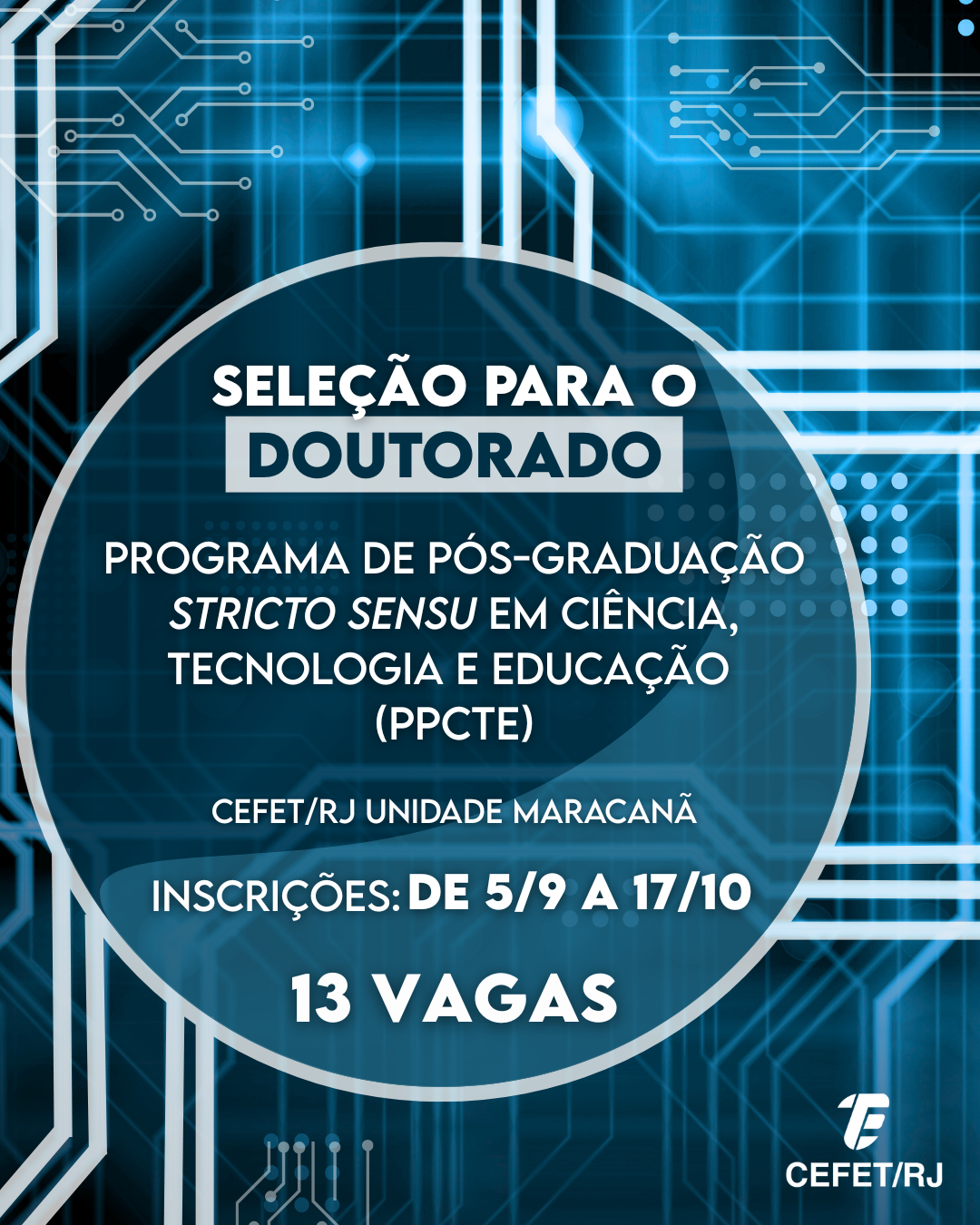 A Diretoria de Pesquisa e Pós-Graduação (DIPPG) divulgou o edital do Programa de Pós-Graduação Stricto Sensu em Ciência, Tecnologia e Educação (PPCTE), que oferece 13 vagas no curso de doutorado. Do total, seis vagas serão reservadas para pessoas pretas, pardas, indígenas e quilombolas e uma vaga para pessoas com deficiência. As inscrições acontecerão de 5/9 a 17/10, por meio do endereço eletrônico processoseletivo.cefet-rj.br.