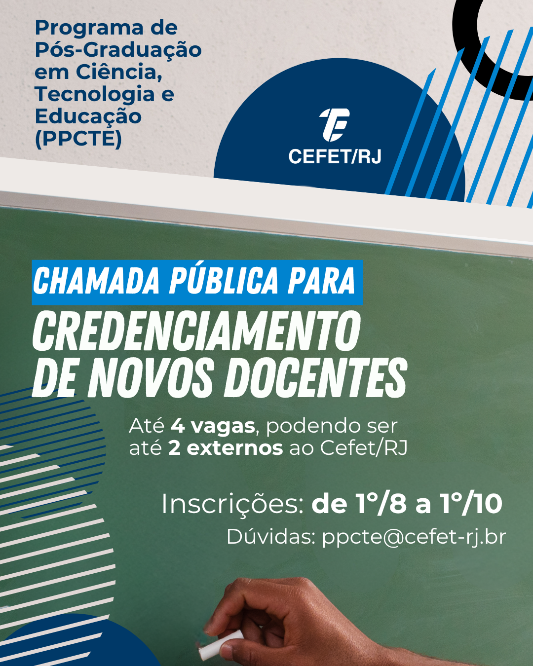 O Programa de Pós-Graduação em Ciência, Tecnologia e Educação (PPCTE) da Unidade Maracanã seleciona até quatro professores doutores, podendo ser até dois externos ao Cefet/RJ, para integrar o quadro de docentes. São ofertadas três vagas para docente colaborador e uma vaga para docente permanente, a serem credenciados, necessariamente, em uma das seguintes linhas do programa: L1 – História e Filosofia da Ciência e da Tecnologia do Ensino; L3 – Novas Abordagens em Educação e Tecnologia; L4 – Formação de Professores em Ciência, Tecnologia e Educação. As inscrições estarão abertas de 1º de agosto até 1º de outubro.