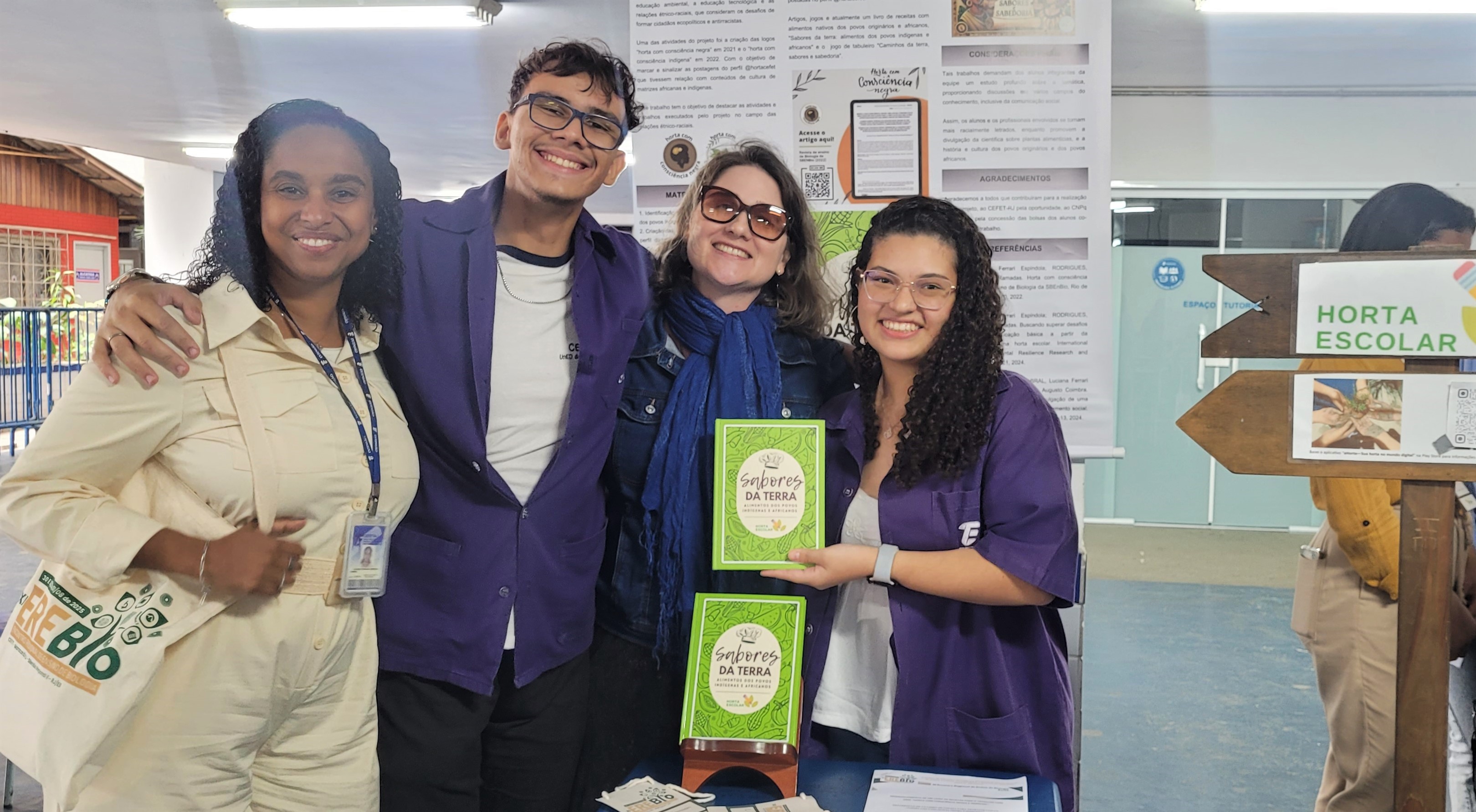 Gabriel Martins e Maria Clara de Lima exibem o livro de receitas Sabores da Terra, ao lado da professora Luciana Espíndola (à esq.), coordenadora do projeto Horta Escolar, e da nutricionista Juliana Rodrigues, da Uned Maria da Graça