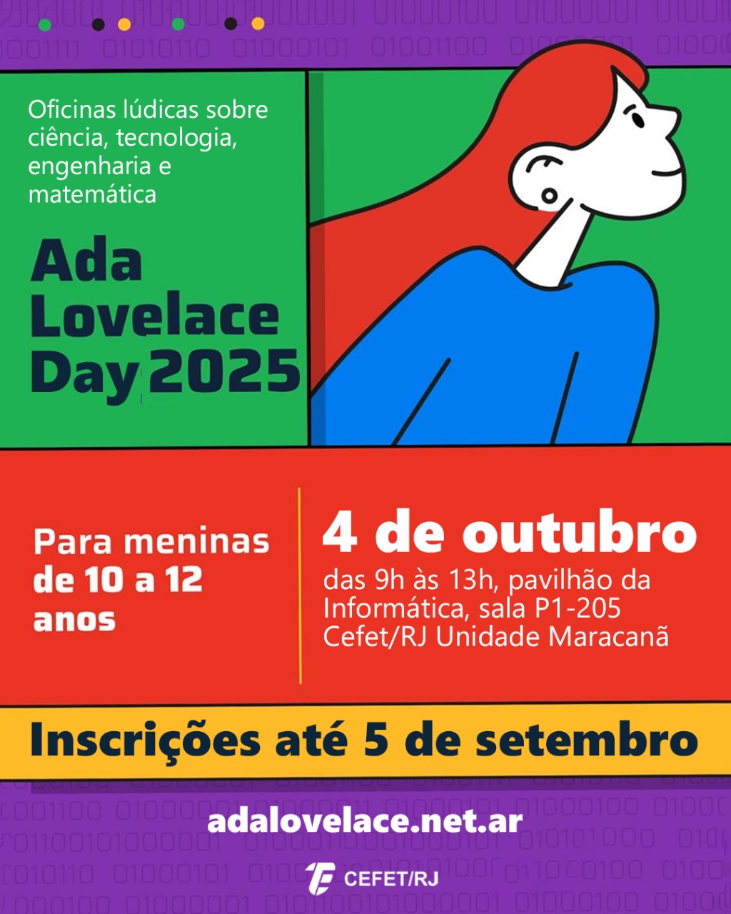 O Cefet/RJ Unidade Maracanã é uma das sedes do Brasil a promover o Ada Lovelace Day 2025, movimento internacional de incentivo à participação de meninas nas áreas de Ciência, Tecnologia, Engenharia e Matemática (STEM, do inglês Science, Technology, Engineering and Mathematics). Serão realizadas atividades lúdico-científicas, oficinas práticas e ações de divulgação científica voltadas para meninas com idades de 10 a 12 anos. O evento acontecerá no dia 4 de outubro (sábado), das 9h às 13h, na sala P1-205, no pavilhão da Informática.