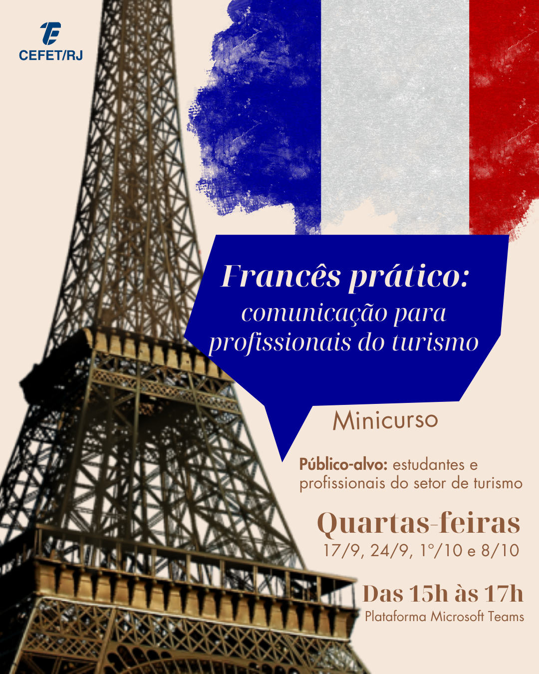 Estão abertas as inscrições, até o dia 13 de setembro, para o minicurso “Francês prático: comunicação para profissionais do turismo”. A atividade terá um total de 8 horas de duração e acontecerá em quatro encontros on-line pela plataforma Microsoft Teams, às quartas-feiras, nos dias 17 e 24 de setembro e 1º e 8 de outubro, das 15h às 17h. Serão oferecidas 25 vagas a serem preenchidas por ordem de inscrição.