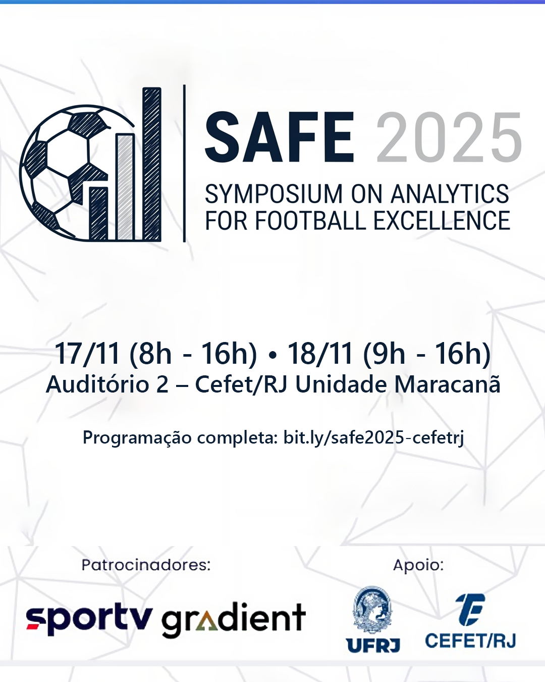Nos dias 17 e 18 de novembro, o Cefet/RJ Unidade Maracanã recebe a segunda edição do Symposium on Analytics for Football Excellence (Simpósio sobre Análise para a Excelência do Futebol - SAFE 2025). O SAFE 2025 reúne pesquisadores, analistas e profissionais de destaque do futebol brasileiro, promovendo um espaço de excelência e integração entre academia, clubes e empresas sobre o uso da ciência de dados, aprendizado de máquina e análise de desempenho no esporte.