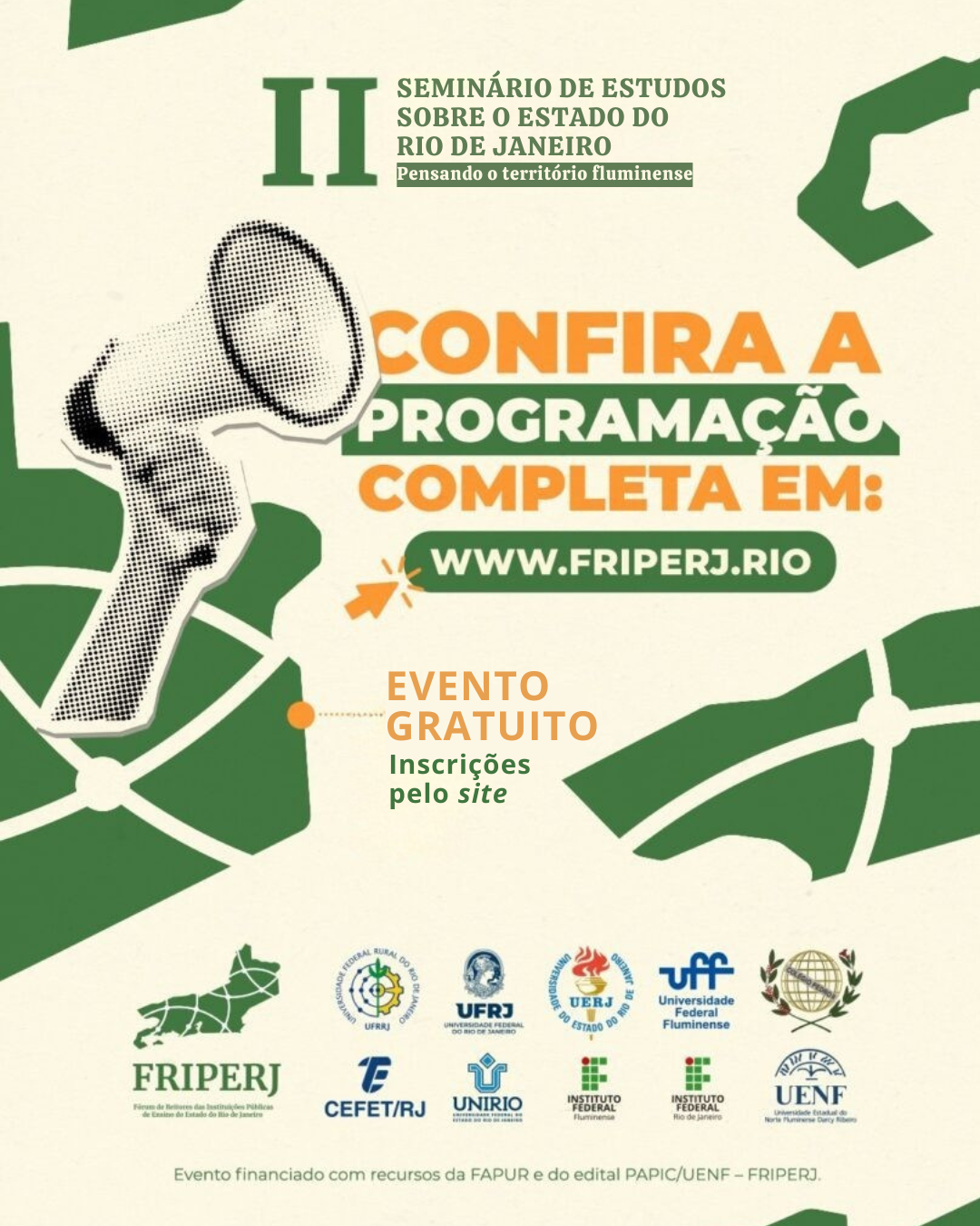 Estão abertas as inscrições para participar do II Seminário de Estudos sobre o Estado do Rio de Janeiro (SEERJ). O evento é organizado pelo Fórum dos Reitores das Instituições Públicas de Ensino do Estado do Rio de Janeiro (Friperj) e será realizado entre os dias 24 e 26 de novembro na Unidade Maracanã do Cefet/RJ. A participação é gratuita e as inscrições podem ser feitas pelo site friperj.rio/ii-seerj.