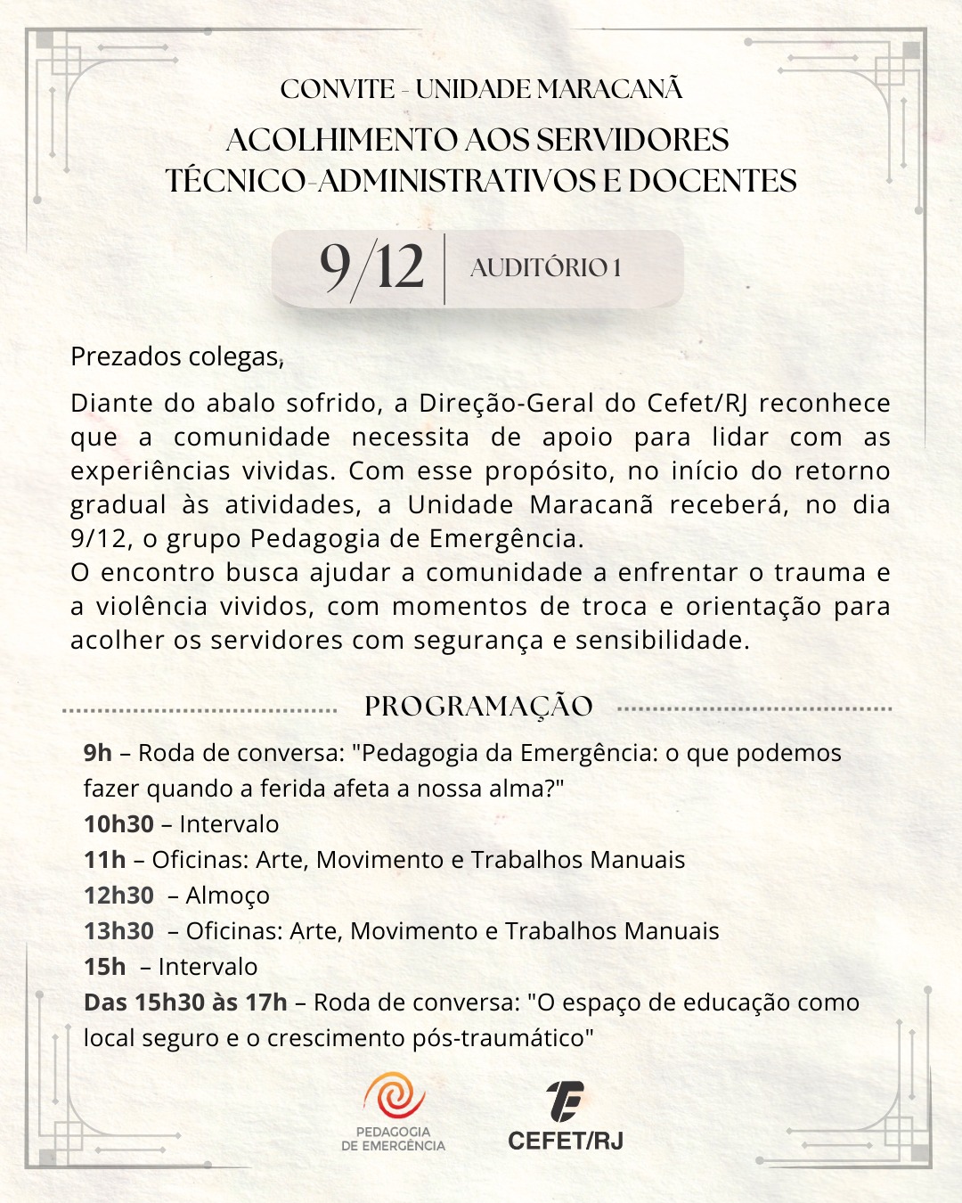 Como parte das ações voltadas ao cuidado emocional dos servidores da Unidade Maracanã, a Direção-Geral do Cefet/RJ oferecerá um momento dedicado à escuta, ao suporte e ao compartilhamento de experiências. As atividades foram especialmente pensadas para auxiliar no enfrentamento deste período delicado, fortalecendo vínculos e promovendo um ambiente seguro para todos.