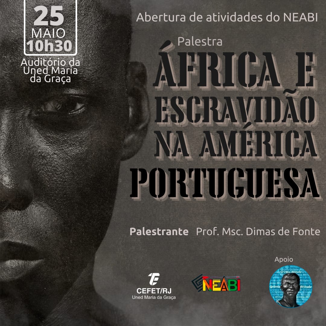 O Núcleo de Estudos Afro-Brasileiros e Indígenas (NEABI) da Uned Maria da Graça informa que, na próxima quinta-feira (25/5), irá promover a palestra “África e escravidão na América Portuguesa”, às 10h30, no auditório da unidade. A atividade será ministrada pelo historiador Dimas de Fonte Silva, mestre em História pela Uerj e professor efetivo da Prefeitura da Cidade do Rio de Janeiro.