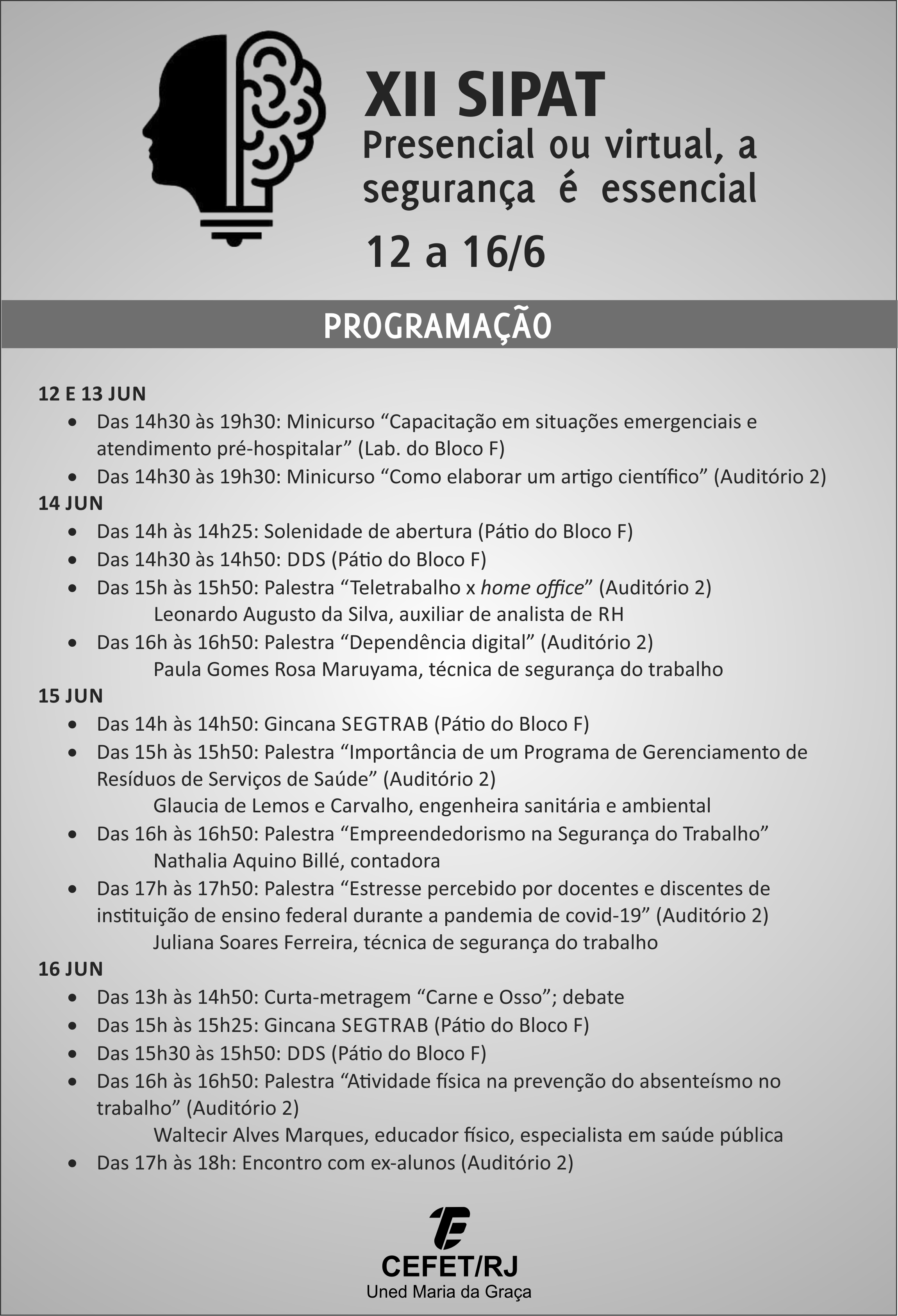 Entre os dias 12 e 16 de junho, o Cefet/RJ Uned Maria da Graça irá promover a XII Semana Interna de Prevenção de Acidentes de Trabalho (SIPAT), com o tema “Presencial ou virtual, a segurança é essencial”. O evento é organizado pela Coordenação do curso técnico em Segurança do Trabalho da unidade e visa ao aprimoramento técnico-prático dos seus estudantes. Como parte da programação, estão previstos minicursos, palestras, gincana, exibição de curta-metragem e encontro com ex-alunos. A XII SIPAT é aberta à comunidade e haverá emissão de certificado para os participantes inscritos.
