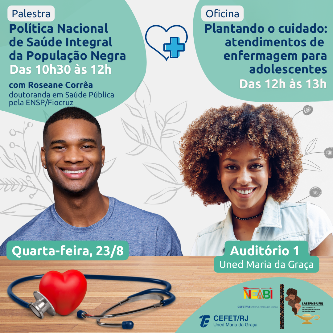 Nesta quarta-feira (23), o Núcleo de Estudos Afro-Brasileiros e Indígenas (NEABI) da Uned Maria da Graça irá realizar palestra e oficina, abertas ao público, voltadas para a área da saúde. As inscrições serão feitas no local, no momento das atividades. Os participantes terão direito a certificado, emitido pelo Departamento de Extensão e Assuntos Comunitários (DEAC). As ações têm apoio do Grêmio Estudantil da unidade e acontecerão no Auditório 1.