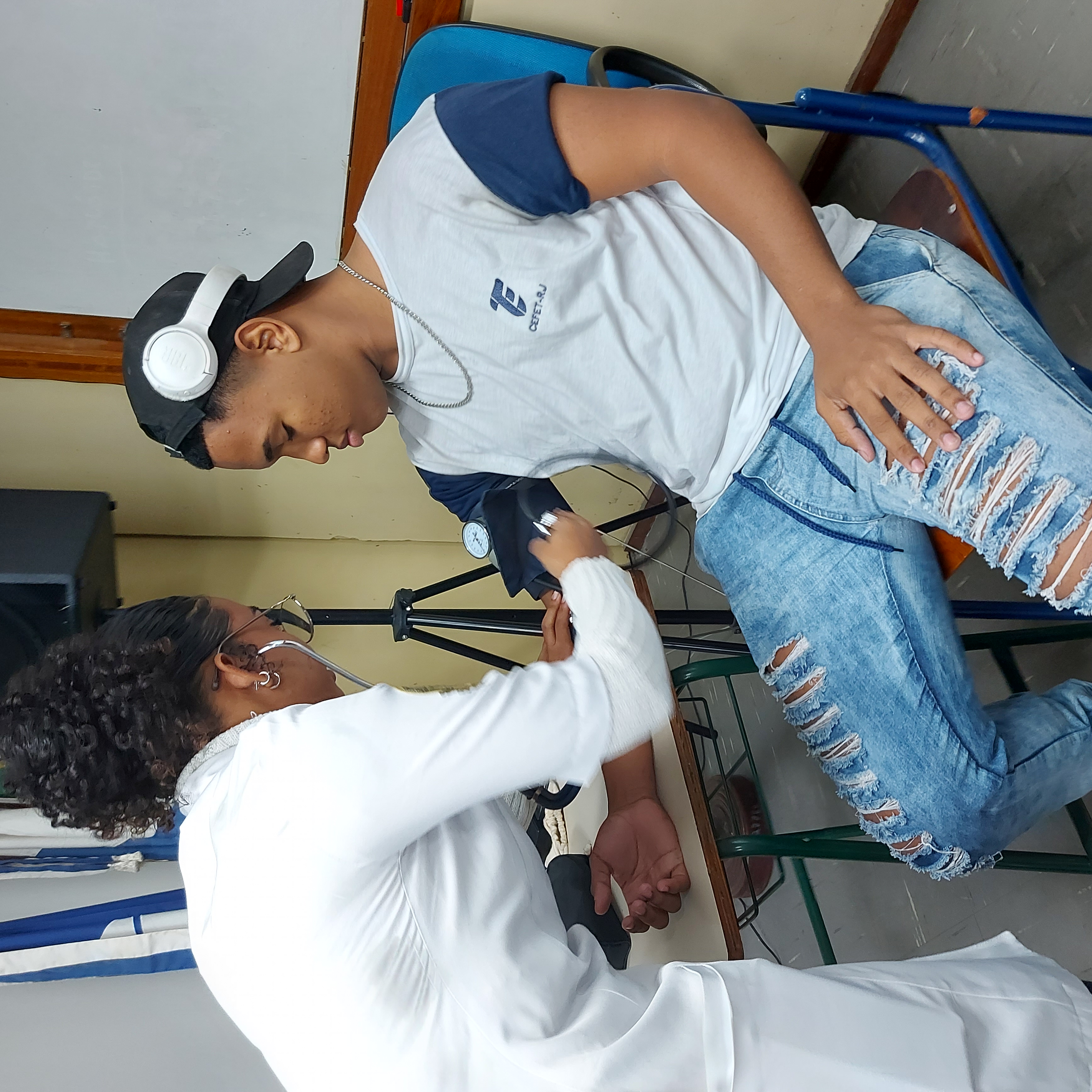 Aluno do Cefet/RJ tem a pressão arterial aferida durante oficina