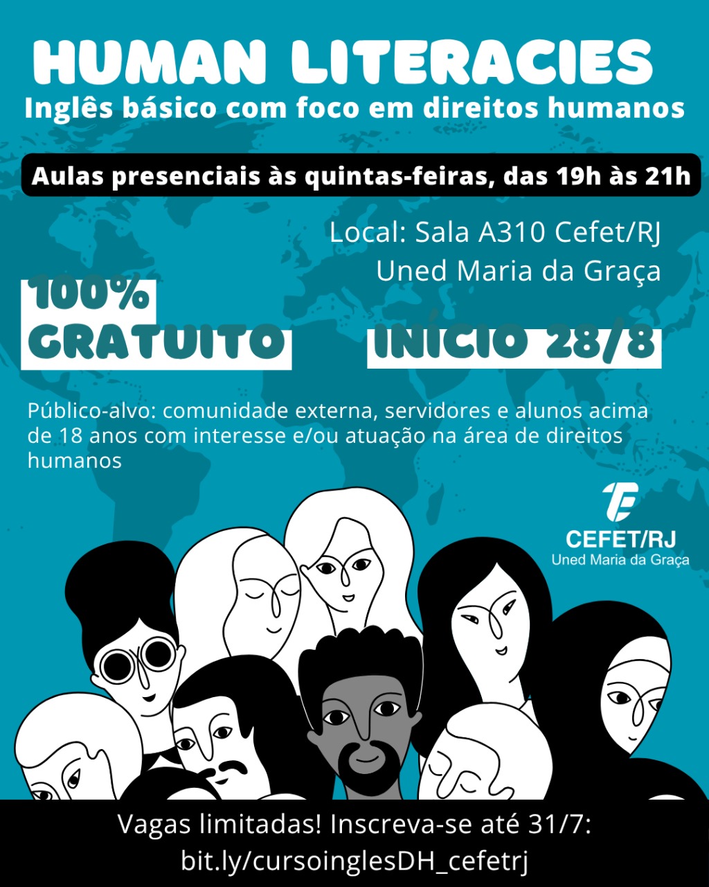 O Cefet/RJ Uned Maria da Graça está com inscrições abertas para o curso de inglês básico “Human Literacies”, que tem como objetivo o ensino da língua inglesa a partir de contextos relacionados aos direitos humanos. O curso é totalmente gratuito e organizado em três módulos presenciais de 20 horas, com aulas às quintas-feiras, das 19h às 21h, realizadas na sala A310 da unidade. O início das aulas está previsto para 28 de agosto.