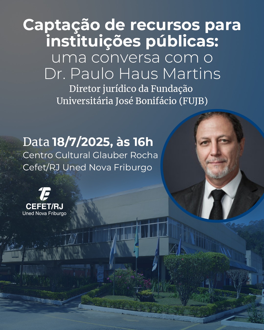 No próximo dia 18 de julho, a Uned Nova Friburgo vai sediar o evento “Captação de recursos para instituições públicas: uma conversa com o Dr. Paulo Haus Martins”. A atividade é aberta a todas as pessoas interessadas no tema e acontecerá no Centro Cultural Glauber Rocha, a partir das 16h. Não é necessário realizar inscrição. O palestrante é diretor jurídico da Fundação Universitária José Bonifácio (FUJB).