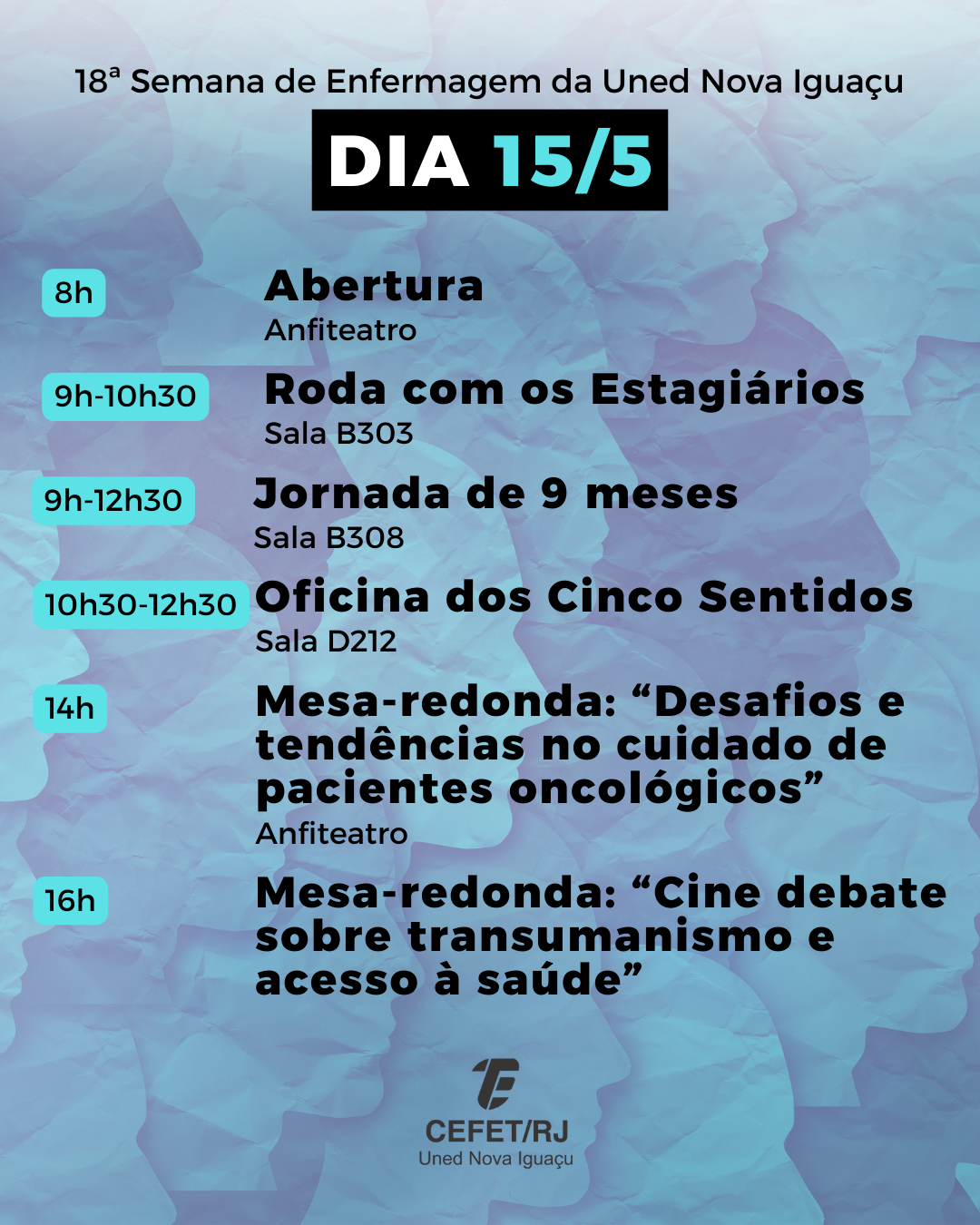 O Cefet/RJ Uned Nova Iguaçu realizará, nos dias 15 e 16 de maio, a 18ª Semana de Enfermagem, que abordará o tema “Saúde planetária: desafios e a atuação crítica da Enfermagem”, proposto pela 84ª Semana Brasileira de Enfermagem (SBEn). A programação começa às 8h e vai até as 17h e contará com apresentações de projetos de docentes e discentes, mesas-redondas e participação de profissionais convidados, com o intuito de instigar reflexões sobre as práticas e os impactos da enfermagem no cenário global da saúde.