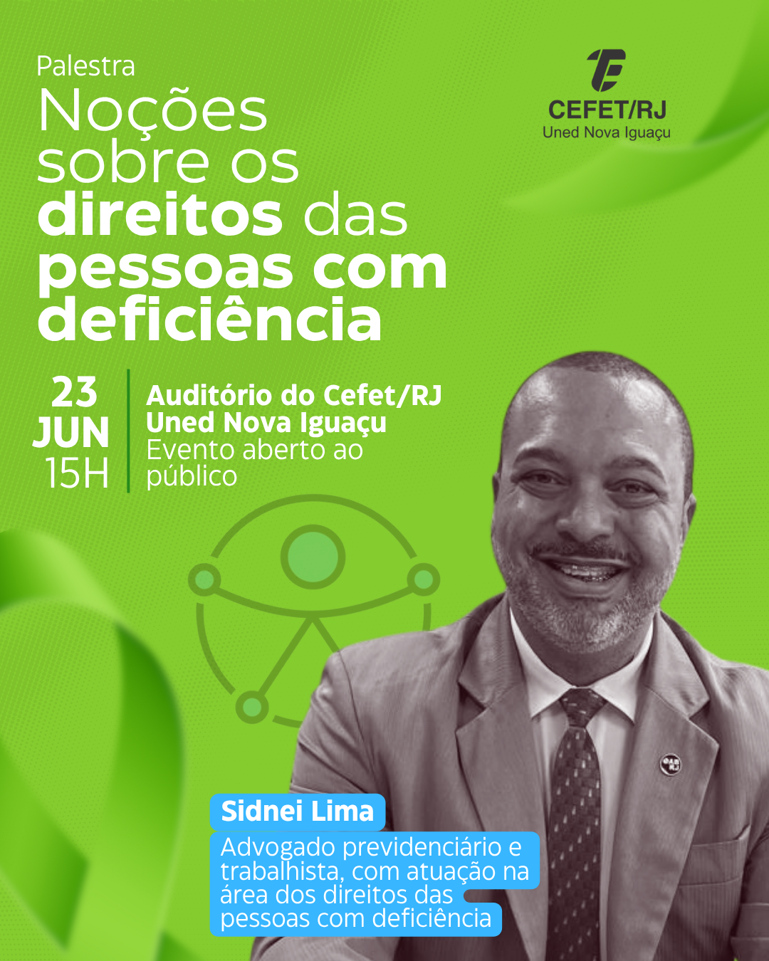 Na próxima segunda-feira (23), o Cefet/RJ Uned Nova Iguaçu vai promover a palestra “Noções sobre os direitos das pessoas com deficiência”, com o advogado Sidnei Lima. O evento acontecerá no Auditório da unidade, a partir das 15h. A atividade é aberta ao público e os participantes terão direito a certificado.