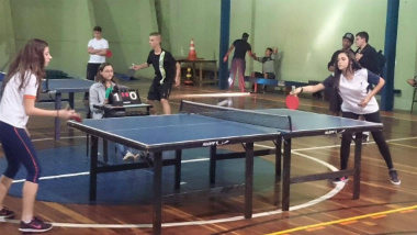 | Gabrielle (à direita), na competição de tênis de mesa dos Jogos Estudantis Unificados de Petrópolis |