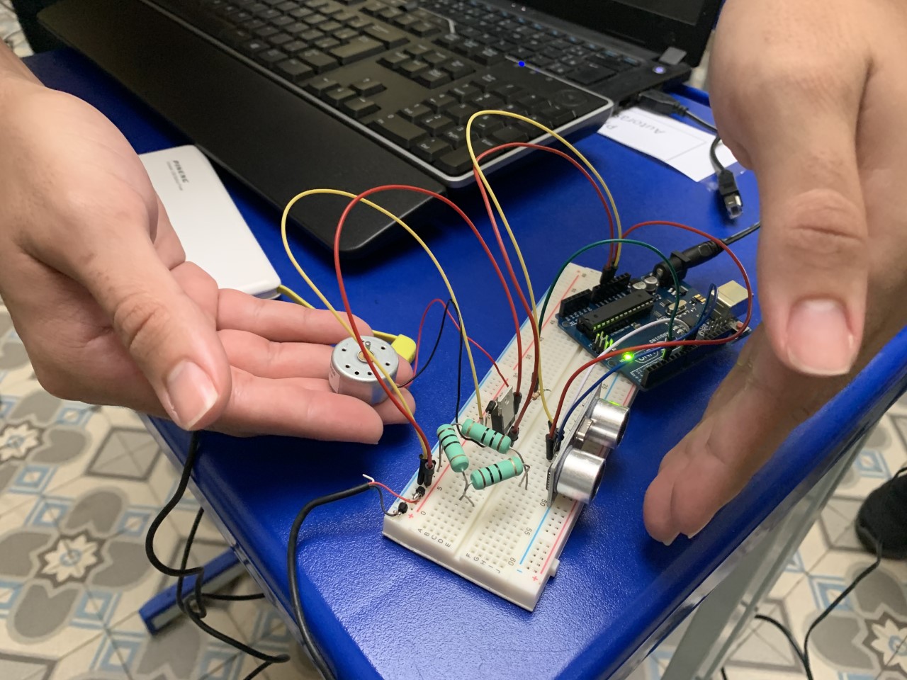 Já a discente do 3º período de licenciatura em Física do campus Petrópolis Juliana de Souza Ferreira buscou trabalhar com uma inovação tecnológica que fosse acessível para pessoas cegas. Sua proposta foi ao encontro da ideia da colega Stefany Lins e as duas criaram um sensor de obstáculos capaz de detectar objetos a longo alcance. Juliana contou que o sensor identifica objetos a partir de 10 centímetros, chegando até 7 metros de distância. “O sensor envia informações para a placa Arduino e o motor vibra para o usuário de acordo com a distância, avisando se o obstáculo está mais perto ou mais longe e evitando colisões”, explicou.
