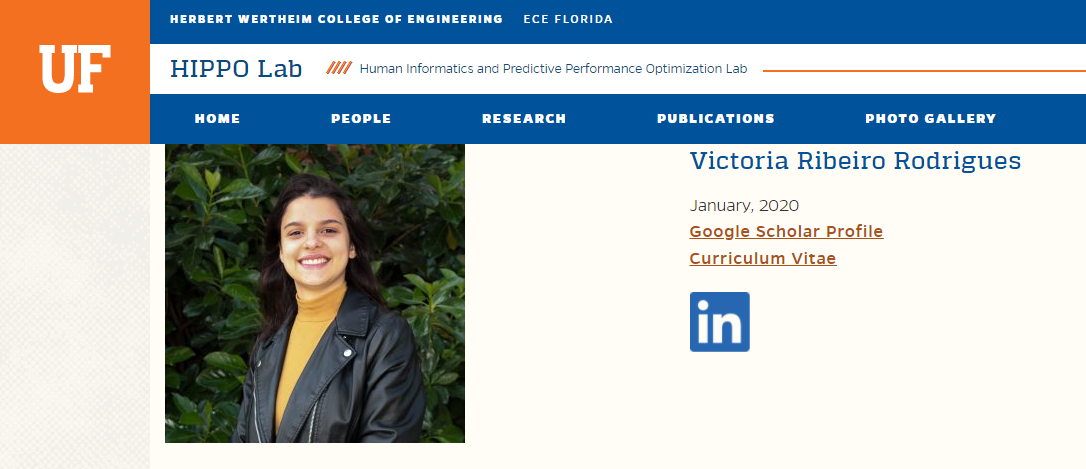 Victoria então ingressou no Departamento de Engenharia Elétrica e Computação da UF e, hoje, trabalha com o professor/orientador Nicholas Napoli no laboratório Human Informatics and Predictive Performance Optimization Lab (Hippo), que tem como foco desenvolver métodos de processamento de sinais e machine learning para entender e melhorar a performance humana. Dentro dessa área, o laboratório tem iniciativas em UTIs de hospitais, com a marinha dos EUA e até com a Nasa.