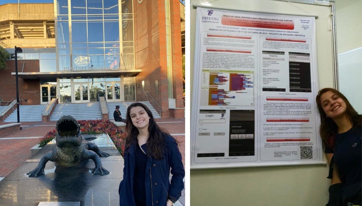 Victoria em frente à Universidade da Flórida (à esq.) e em sua primeira apresentação de pôster no Cefet/RJ campus Petrópolis (à dir.).