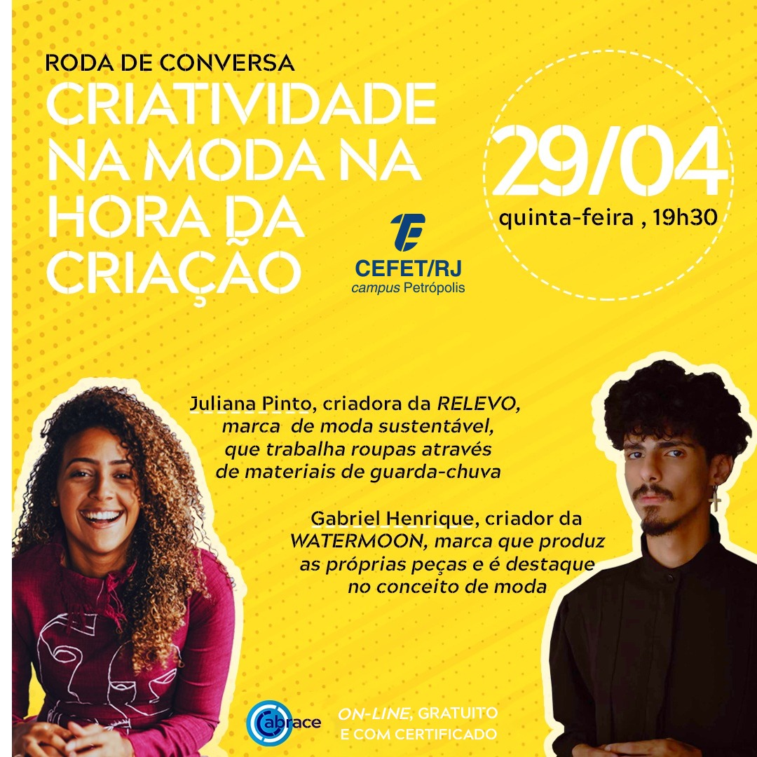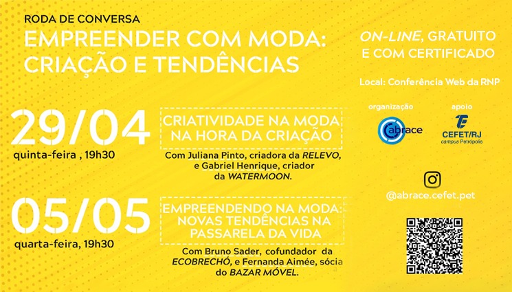 Nos próximos dias 29 de abril e 5 de maio, o projeto de extensão Abrace, do Cefet/RJ campus Petrópolis, irá realizar um ciclo de rodas de conversa on-line intitulado “Empreender com moda: criação e tendências”. O evento, que é voltado para empreendedores que trabalham com moda e criação de roupas e acessórios, acontecerá em ambas as datas, às 19h30, pela plataforma Conferência Web, da RNP. O ciclo contará com a participação de profissionais e empresários da área, que falarão sobre como transformaram a criatividade em produto, seus erros e acertos, como encontraram seu público, definiram sua marca e hoje são referência no mercado da moda.