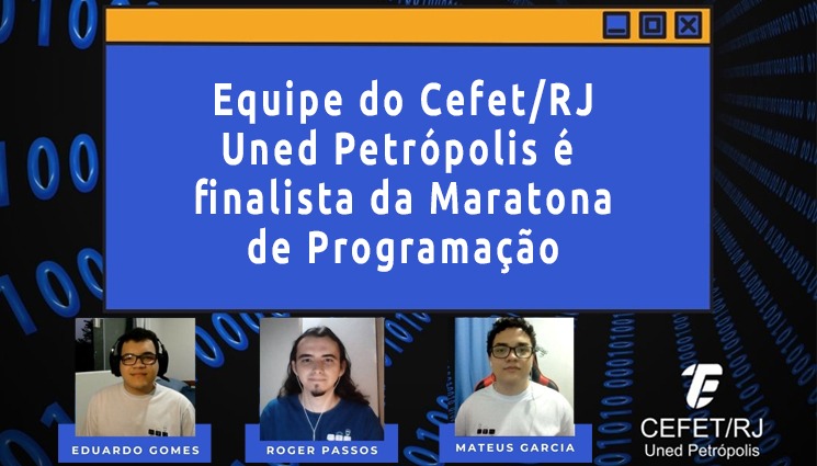 Pelo segundo ano consecutivo, o Cefet/RJ será representado na final nacional da Maratona de Programação. O trio “random.choice (funny_names)” – formado por Eduardo Gomes, Mateus Garcia e Roger Passos, do curso de Engenharia de Computação da unidade Petrópolis –, ficou em 7º no estado do Rio de Janeiro e garantiu uma vaga na final, que acontecerá presencialmente em Gramado (RS), de 31 de março a 2 de abril de 2022.