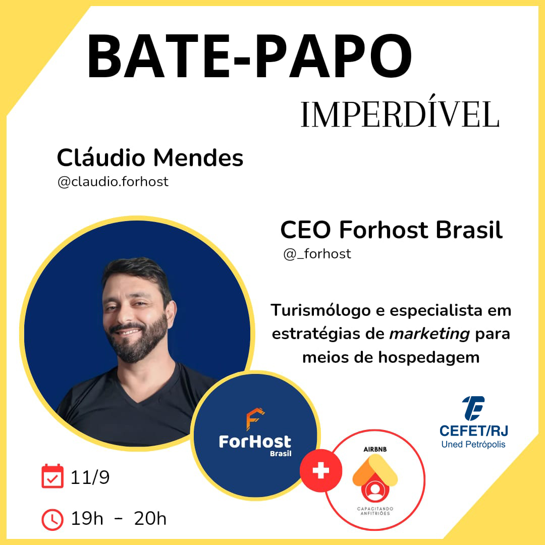 Na próxima segunda-feira, dia 11 de setembro, o projeto de extensão do Cefet/RJ Uned Petrópolis “Airbnb: capacitando anfitriões” irá promover um bate-papo imperdível com Cláudio Mendes, turismólogo e especialista em estratégias de marketing para meios de hospedagem. O evento, que acontecerá on-line pelo Google Meet, das 19h às 20h, é gratuito e aberto ao público em geral.