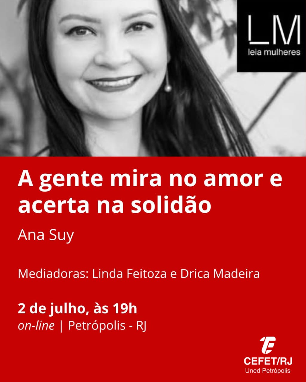 O clube de leitura Leia Mulheres Petrópolis vai discutir o livro “A gente mira no amor e acerta na solidão”, da escritora, professora e psicanalista Ana Suy. A obra aborda o amor desde a infância até a fase adulta da vida e mistura psicanálise, pesquisas teóricas e experiências vividas pela autora em salas de aula, sessões de análise e conversas com amigos.