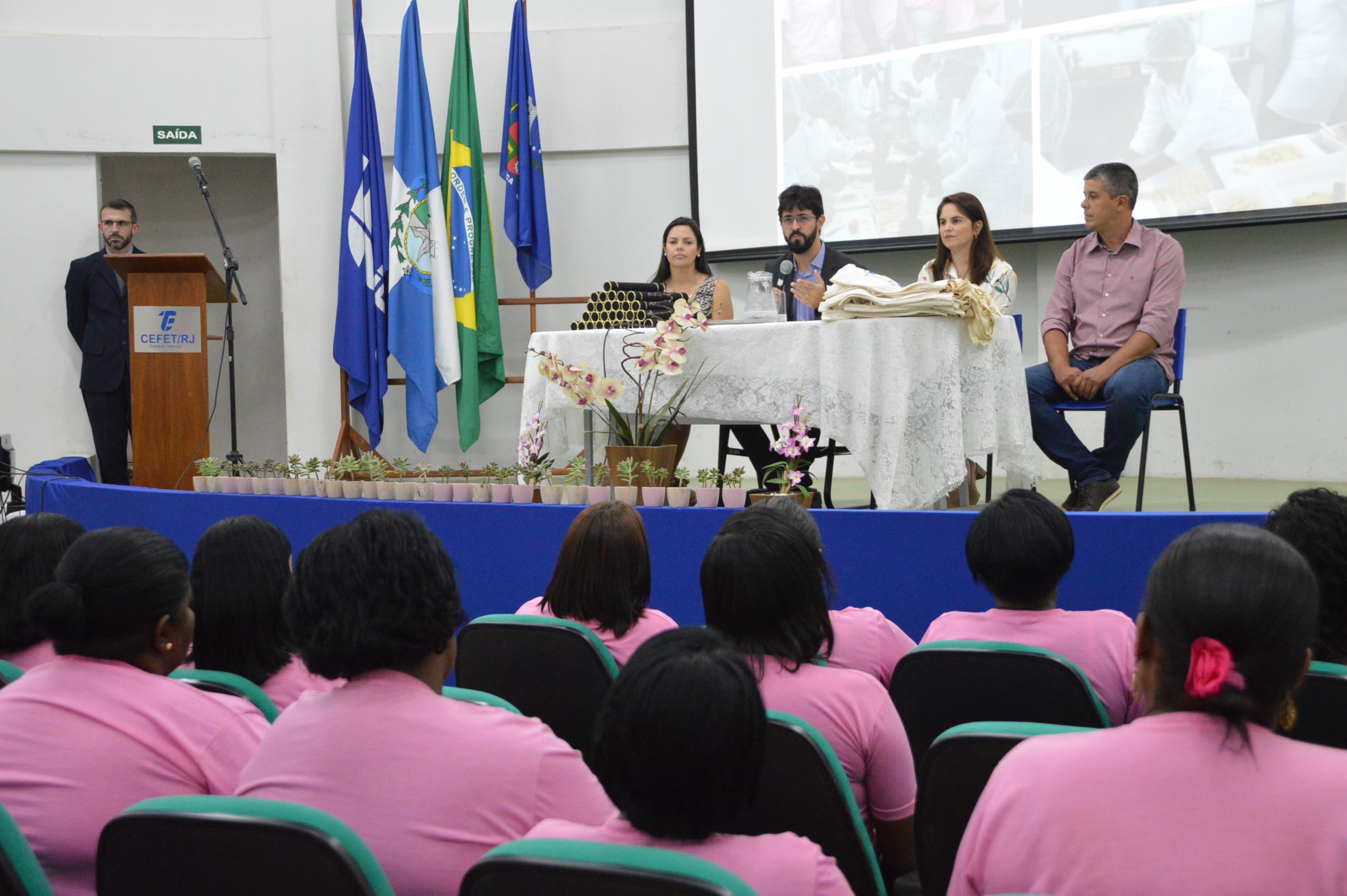 Larissa tem 22 anos e é uma das mais jovens da turma de 27 mulheres que concluíram o curso na tarde da última quinta-feira (5). Na semana do Dia Internacional da Mulher, as moradoras do distrito de Abarracamento, área rural do município de Rio das Flores, receberam seus certificados em uma cerimônia no auditório do campus Valença, com a presença do diretor do campus, Fabiano Oliveira, da professora Alba Rodrigues, coordenadora do projeto de extensão, da secretária de Governo do município de Rio das Flores, Sílvia Novaes Guedes, e do secretário de Agricultura Rodrigo Lima de Novaes. “Eu acredito muito no poder da educação. Eu sei do esforço que foi para vocês concluírem o curso. Vocês são mulheres de muita garra. O Cefet/RJ só se fortalece com projetos assim”, disse o diretor do campus na abertura da cerimônia.