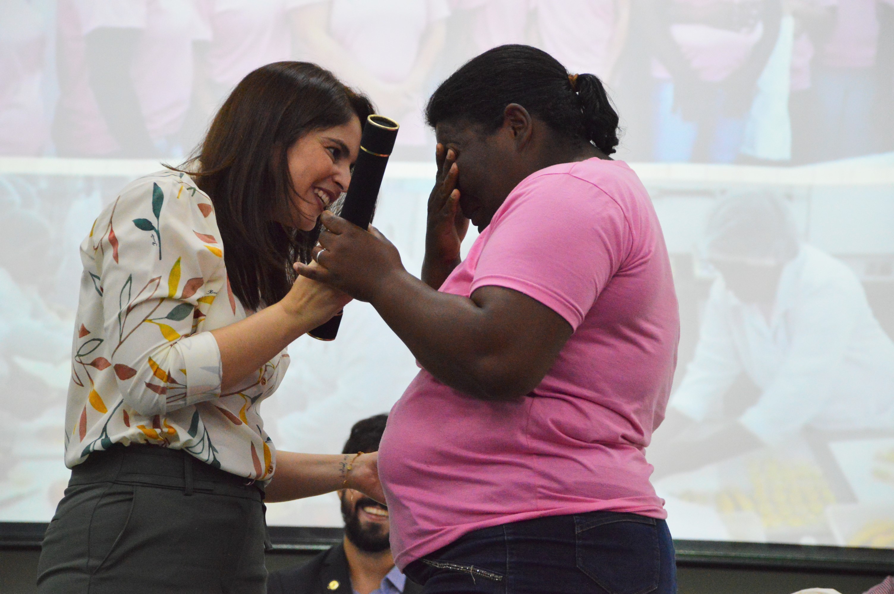Larissa Felix ao lado da mãe, Luzia Felix; na segunda foto, a aluna Robertina dos Passos emocionada ao receber o diploma