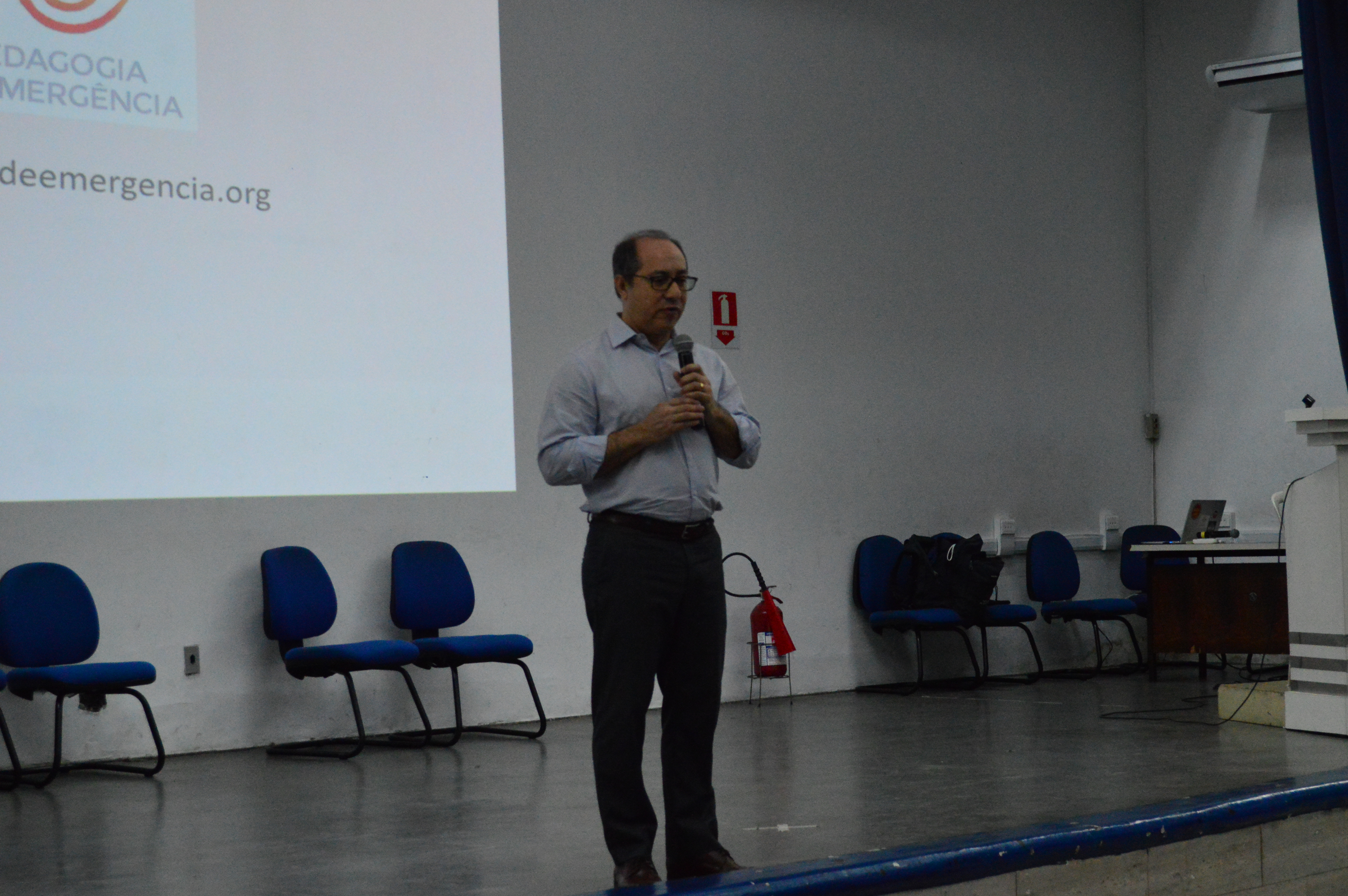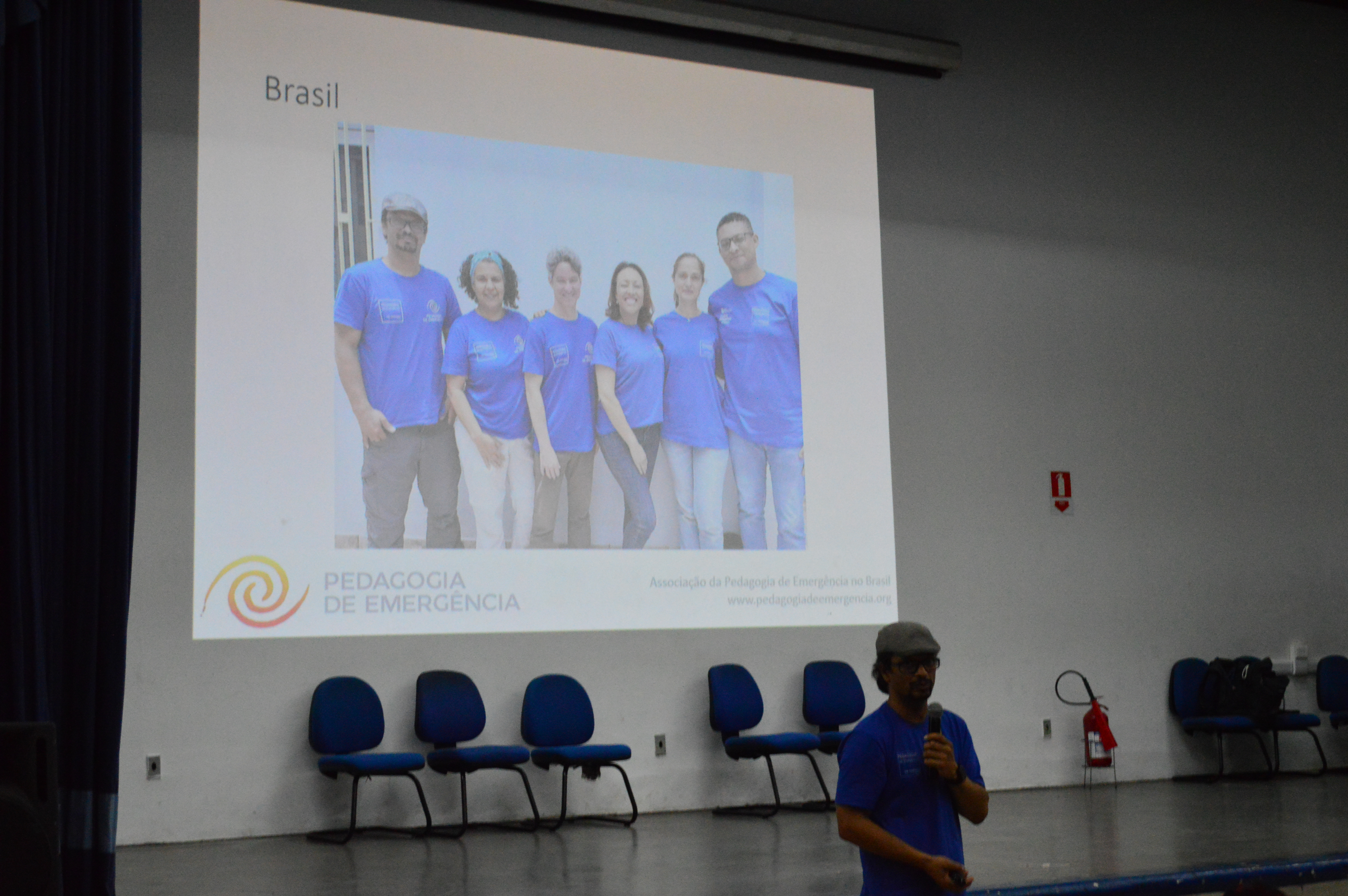 O evento de abertura seguiu com a palestra de Reinaldo Nascimento, psicólogo da Associação da Pedagogia de Emergência no Brasil, sobre o tema “Pedagogia de Emergência: o que fazer quando a ferida afeta a nossa alma?”. Durante sua fala, Nascimento apresentou os conceitos de trauma, seus diversos tipos e fases após um evento traumático extremo e, também, explicou as maneiras como os profissionais da educação podem se apoiar e dar suporte a estudantes que acabaram de passar por um evento traumático. O psicólogo sintetizou que “o trabalho pedagógico tem que ocorrer junto com o terapêutico”. A Pedagogia de Emergência é uma metodologia voltada principalmente a crianças e jovens e visa auxiliá-los a superarem feridas emocionais causadas por situações extremas, como guerras, violência em áreas urbanas e desastres naturais.