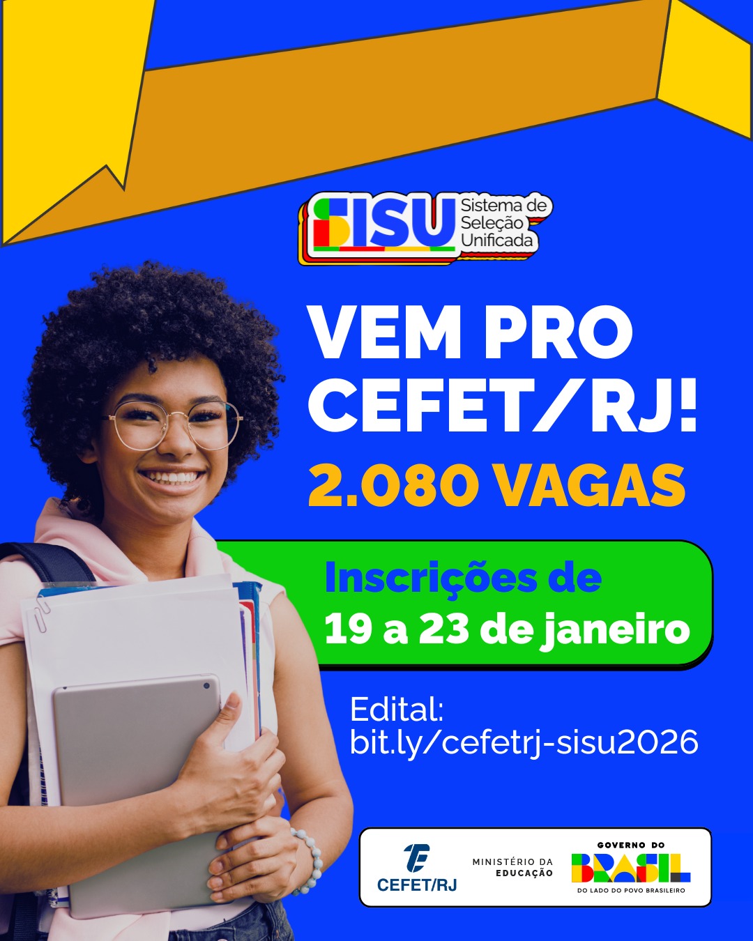 Na quarta-feira (14), o Cefet/RJ divulgou o edital do processo seletivo para ingresso nos cursos de graduação da instituição. Neste certame, são ofertadas 2.080 vagas a serem preenchidas no 1º e no 2º semestres de 2026. As inscrições poderão ser realizadas entre os dias 19 e 23 de janeiro, exclusivamente pelo site do Sistema de Seleção Unificada (Sisu), no endereço acessounico.mec.gov.br/sisu. Não há cobrança de taxa. Estão aptos a concorrer no processo seletivo os candidatos que participaram de uma ou mais edições do Exame Nacional do Ensino Médio (Enem), referentes aos anos de 2023, 2024 e 2025*, e obtiveram a pontuação mínima exigida para cada curso.