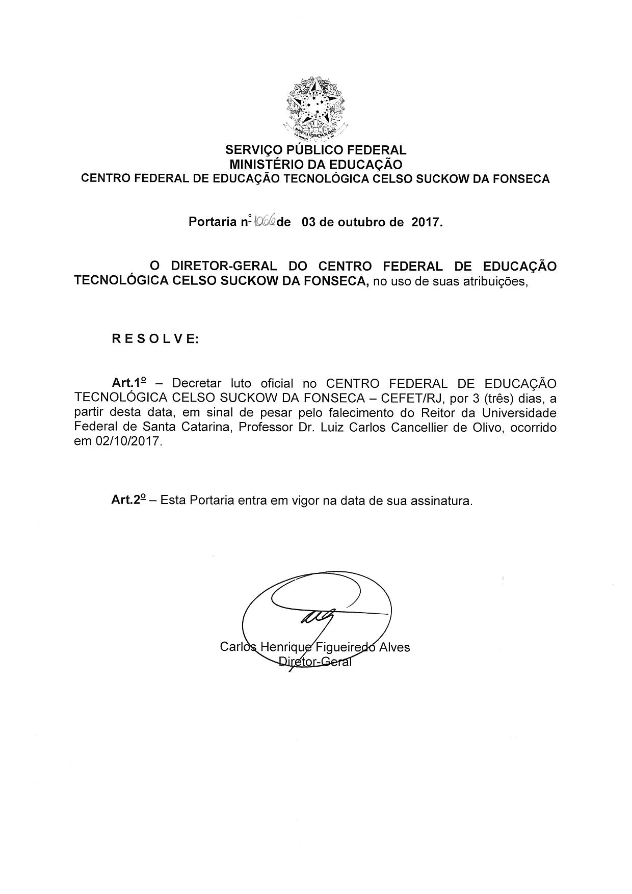 É com grande tristeza que a Direção-Geral do Centro Federal de Educação Tecnológica Celso Suckow da Fonseca (Cefet/RJ) recebe a notícia do falecimento do professor Luiz Carlos Cancellier, reitor da Universidade Federal de Santa Catarina, ocorrido na manhã de segunda-feira, dia 2 de outubro de 2017. Registramos nosso profundo pesar e compartimos da dor de familiares, amigos e comunidade da UFSC.