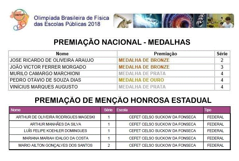 O Cefet/RJ foi o principal destaque na cerimônia de premiação da Olimpíada Brasileira de Física 2018 (OBF e OBFEP) e, entre diversos prêmios, recebeu o de Melhor Escola Federal. No total, 72 alunos do estado do Rio de Janeiro foram premiados e os estudantes do Cefet/RJ receberam duas medalhas de bronze, duas de prata e uma de ouro, além de cinco prêmios de Menção Honrosa na disputa estadual. O evento é organizado pela Sociedade Brasileira de Física e a solenidade de entrega dos prêmios aconteceu no dia 23 de maio na UERJ.