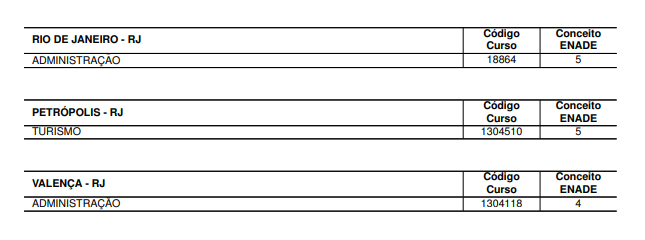 Na semana passada, o Instituto Nacional de Estudos e Pesquisas Educacionais Anísio Teixeira (Inep) divulgou os resultados do Enade 2018. O curso de Turismo do campus Petrópolis e o curso de Administração do campus Maracanã obtiveram conceito 5 – a nota máxima no exame, em uma escala de 1 a 5. O curso de Administração do campus Valença também foi muito bem avaliado, obtendo o conceito 4.
