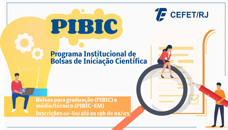 Estão abertas, até as 18h do dia 06/05, as inscrições no Programa Institucional de Bolsas de Iniciação Científica para alunos dos cursos de graduação (PIBIC) e do ensino médio/técnico (PIBIC-EM) do Cefet/RJ. O programa é voltado ao desenvolvimento do pensamento científico, com o intuito de estimular o interesse pela pesquisa. As inscrições deverão ser realizadas exclusivamente on-line, por meio do formulário eletrônico disponível em http://www.dippg.cefet-rj.br/pibic/.