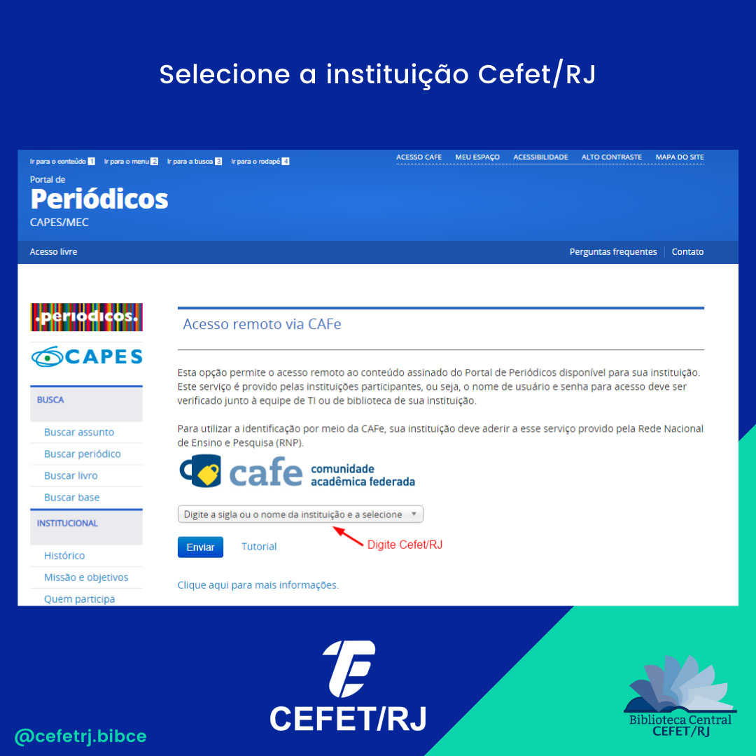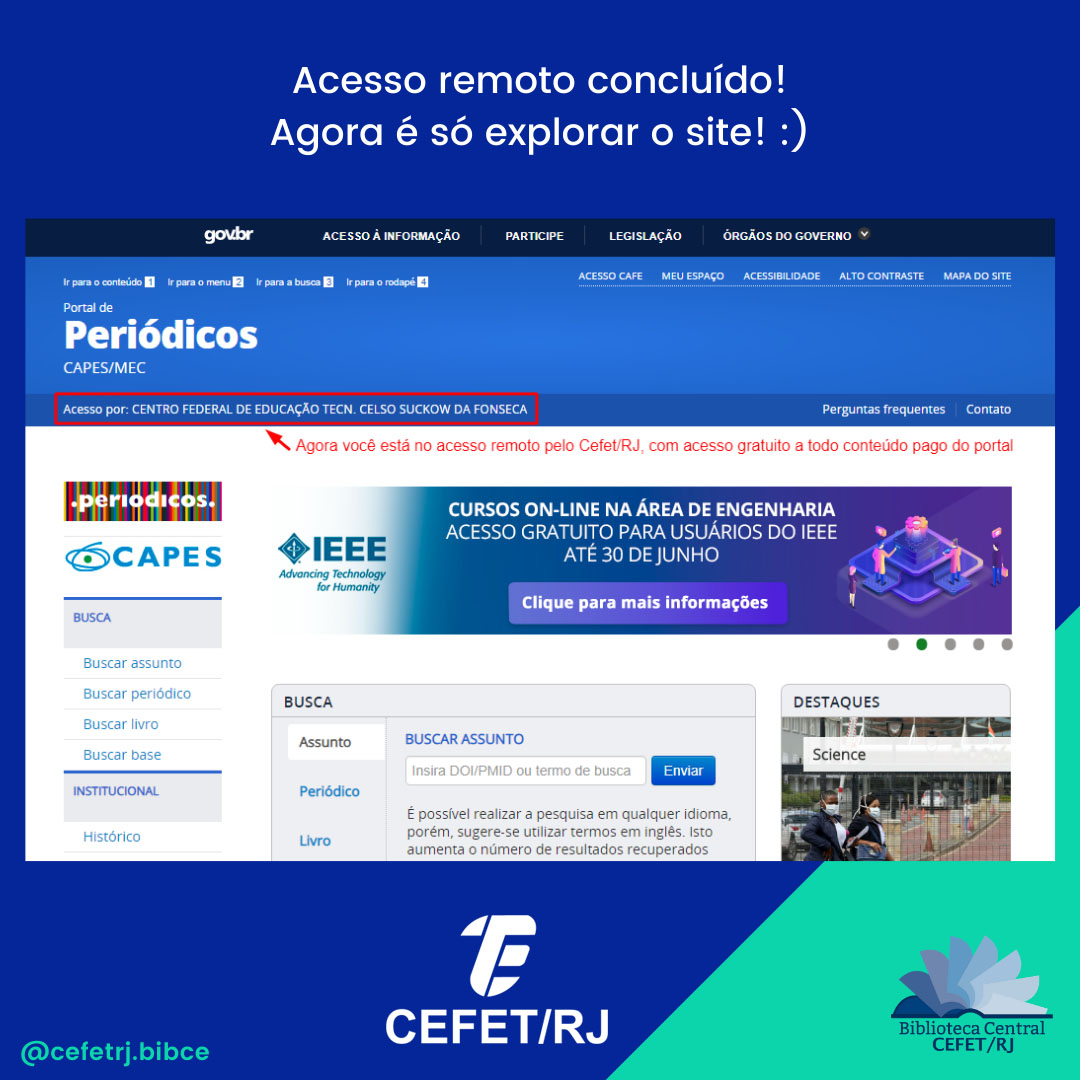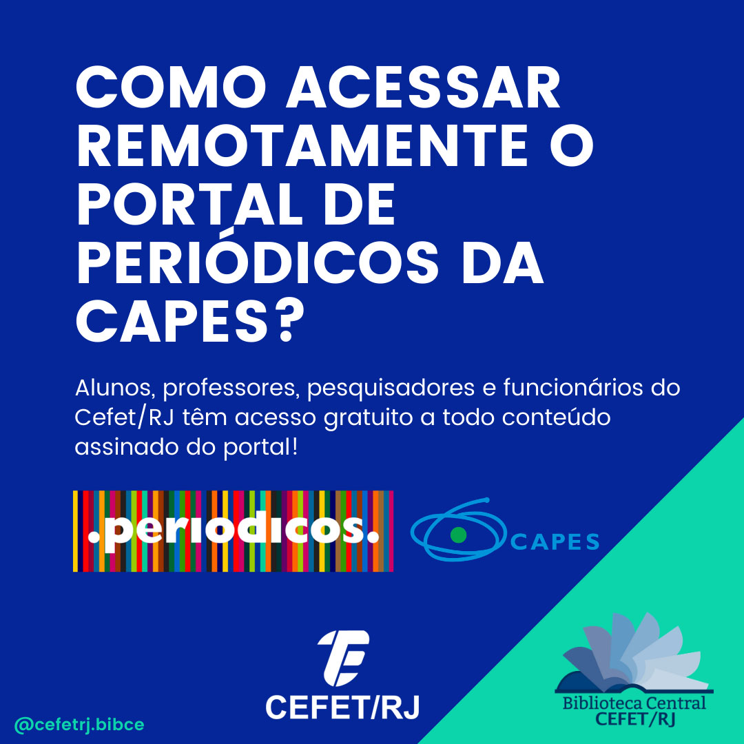 A Biblioteca Central do Cefet/RJ preparou um tutorial com os procedimentos para quem deseja acessar remotamente o Portal de Periódicos CAPES. Alunos, servidores docentes e técnico-administrativos do Cefet/RJ têm acesso livre e gratuito a todo o conteúdo do portal, basta fazer o login utilizando o CPF e a senha do e-mail institucional.